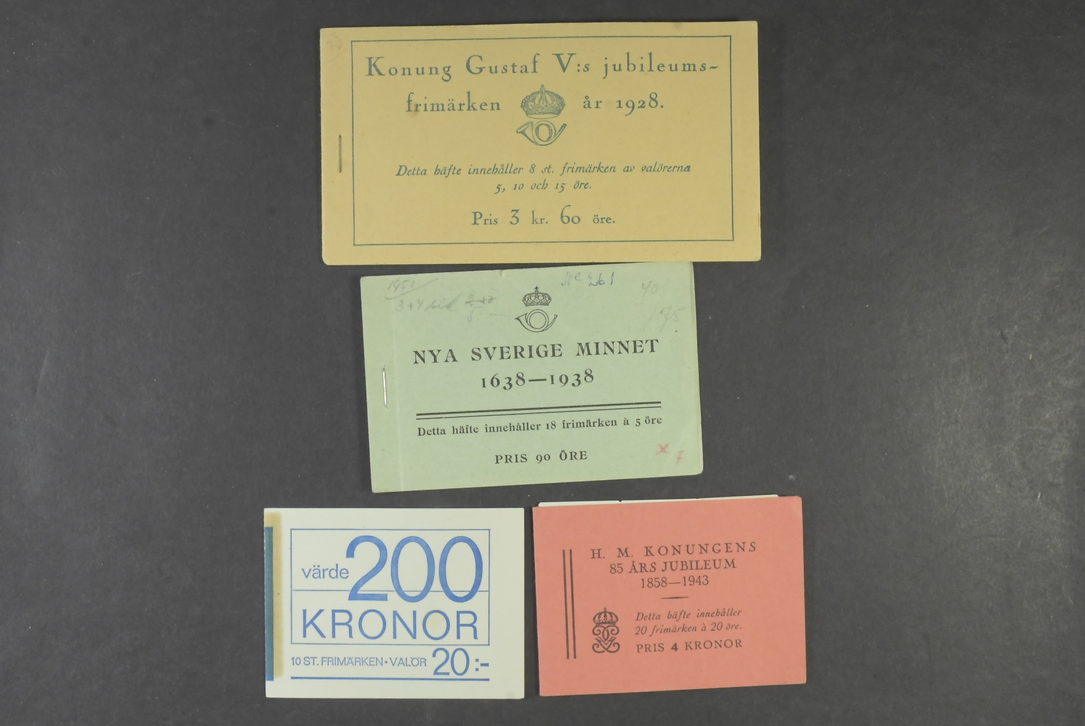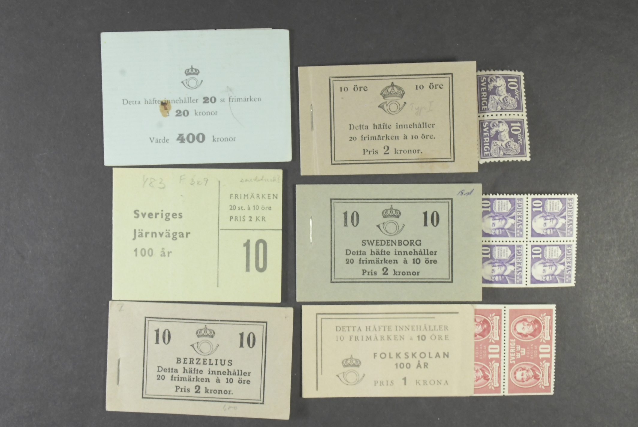 Sweden. Booklets. Lot 10 mainly incomplete booklets 1920s–1950s incl 3 BC pairs New Sweden, 9 BC Swedenboerg, 20x20kr Swan booklet with 14 stamps left, 20kr Swans complete with damaged cover etc.