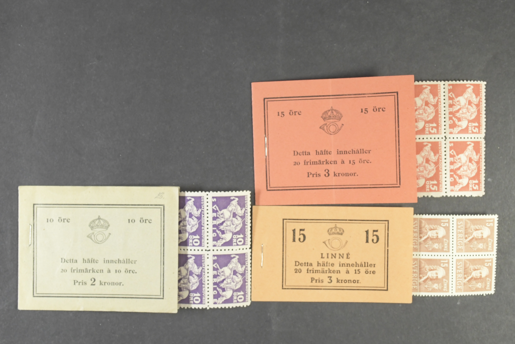 Sweden. Booklets. Five handmade booklets (10 ö Lützenx2, 15 ö Lützen, 10 ö Postal Service 1936 and 15 ö Linné perf four sides), some covers with creases/minor faults.