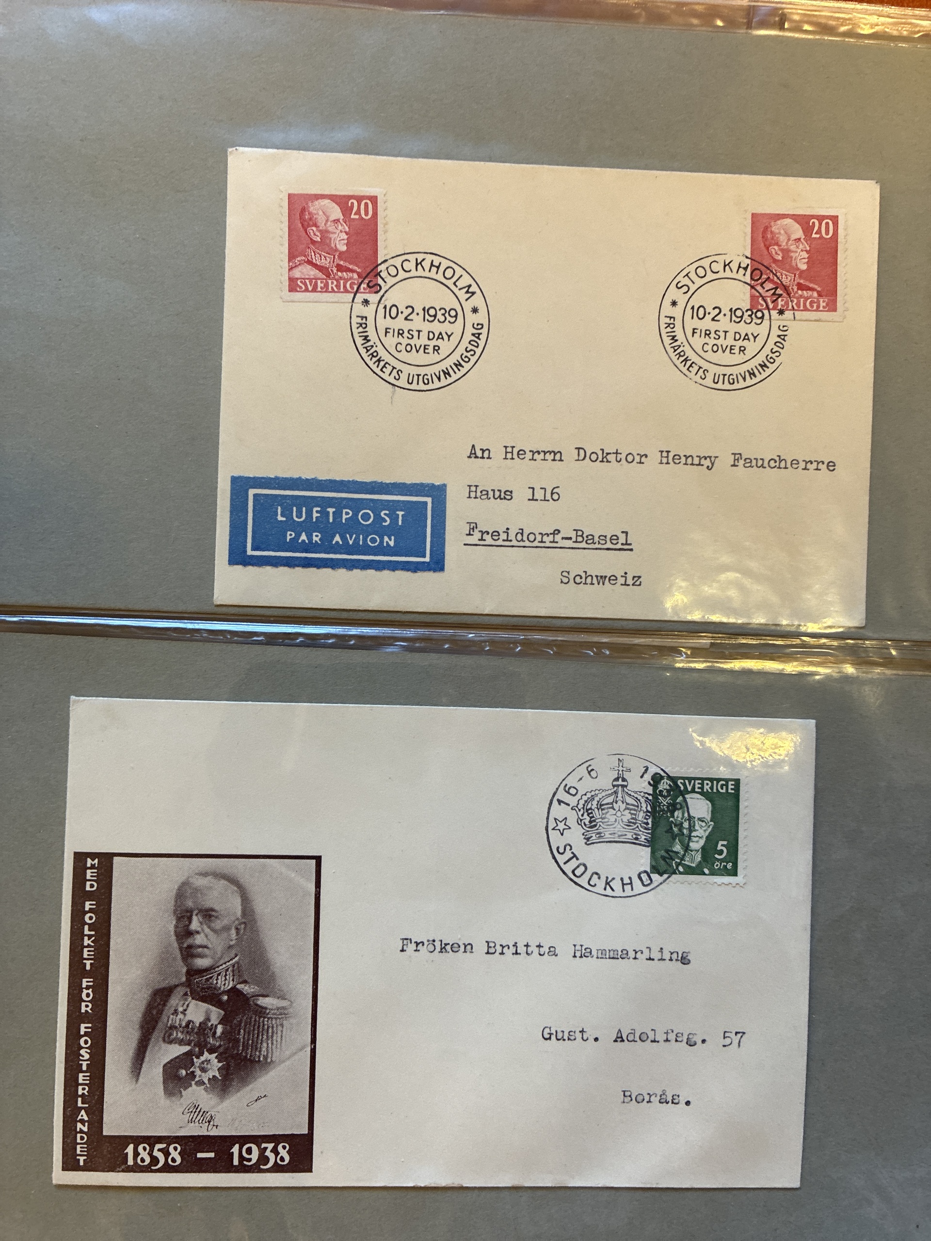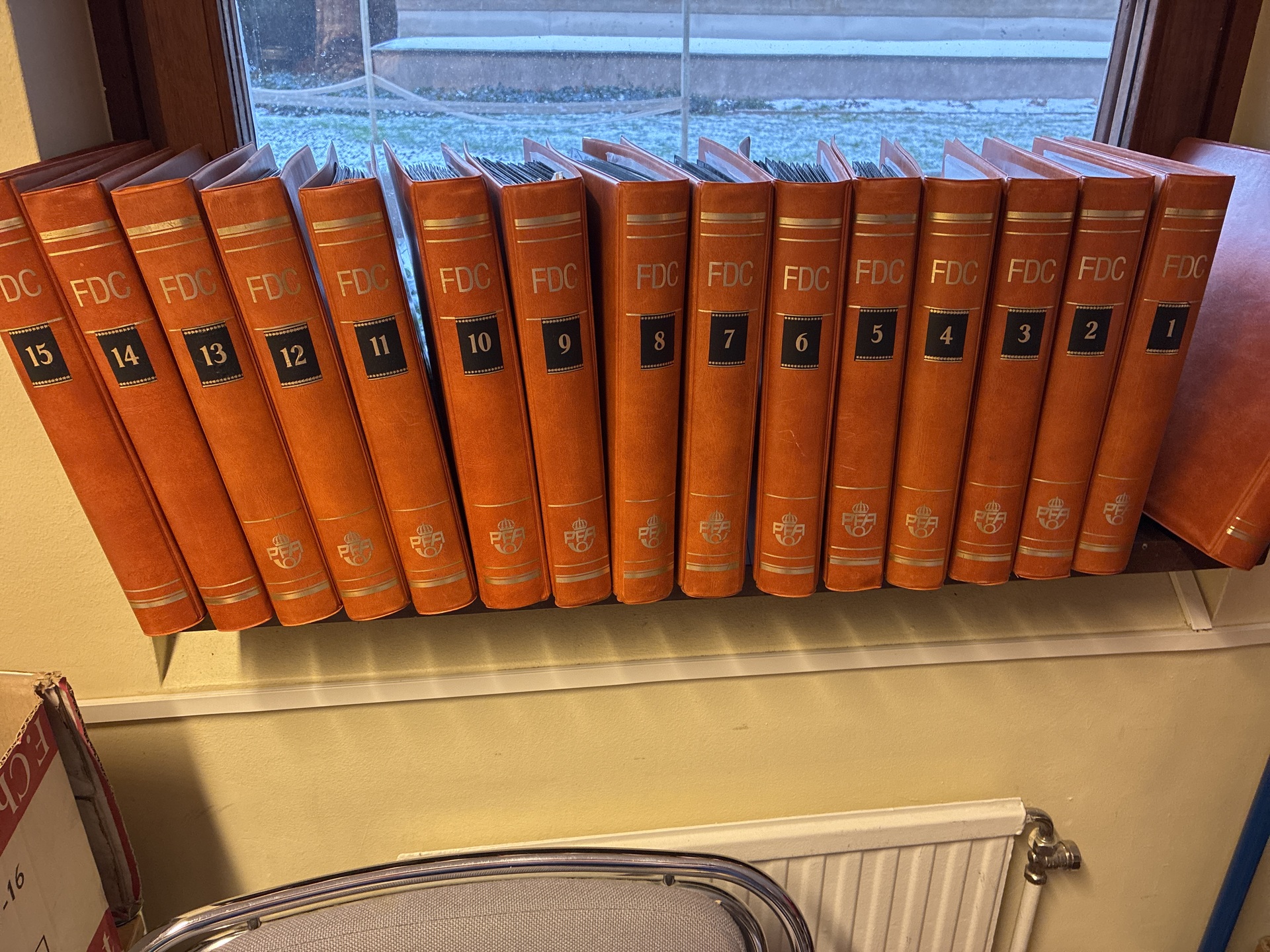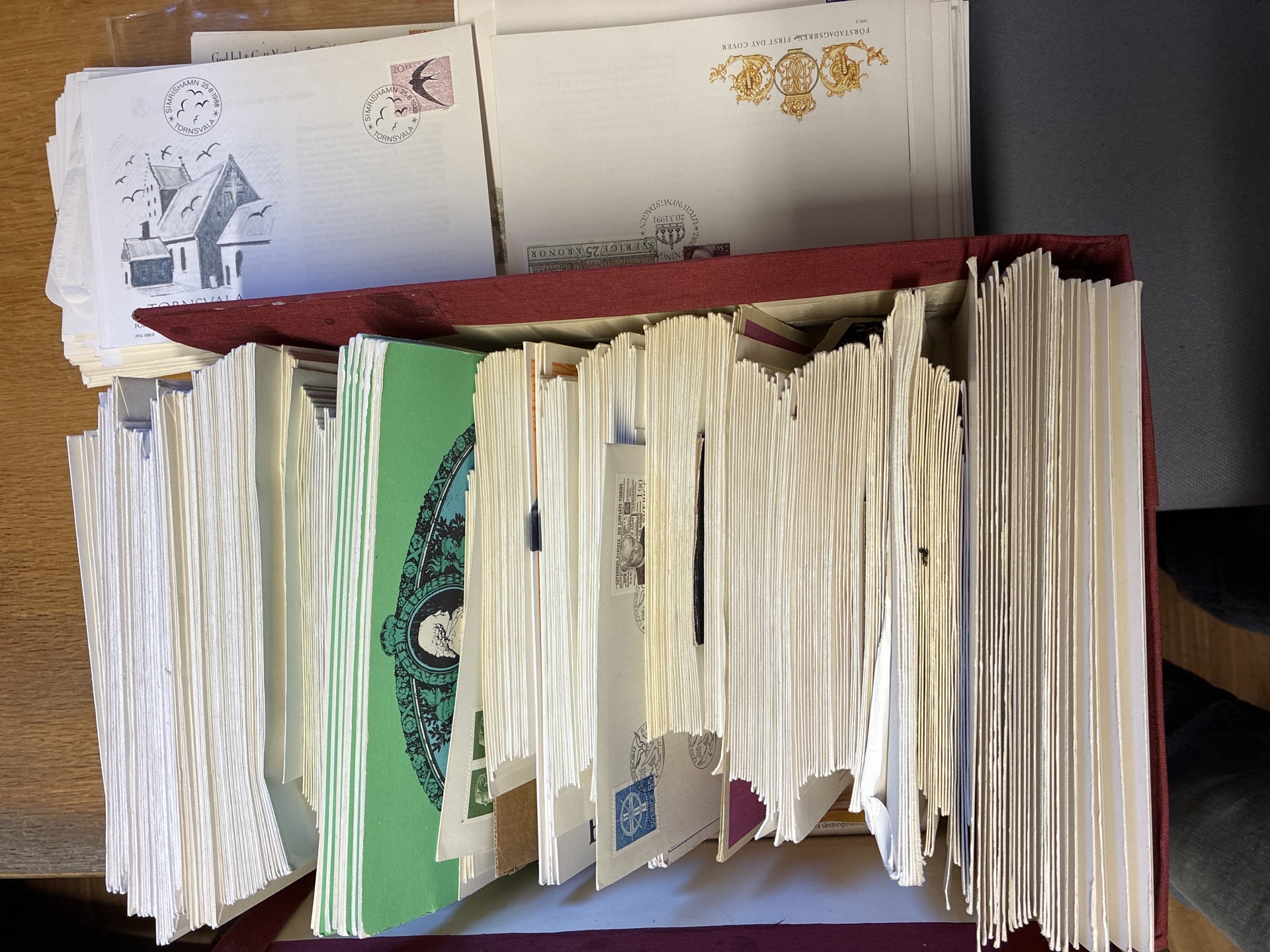 Sweden. FDCs, collection/accumulation 1935–2002 in removal box. 15 brown PFA albums and two boxes and some foreign FDC. Please see a selection of scans at www.philea.se. Mostly fine quality. Approx. 42 kg.