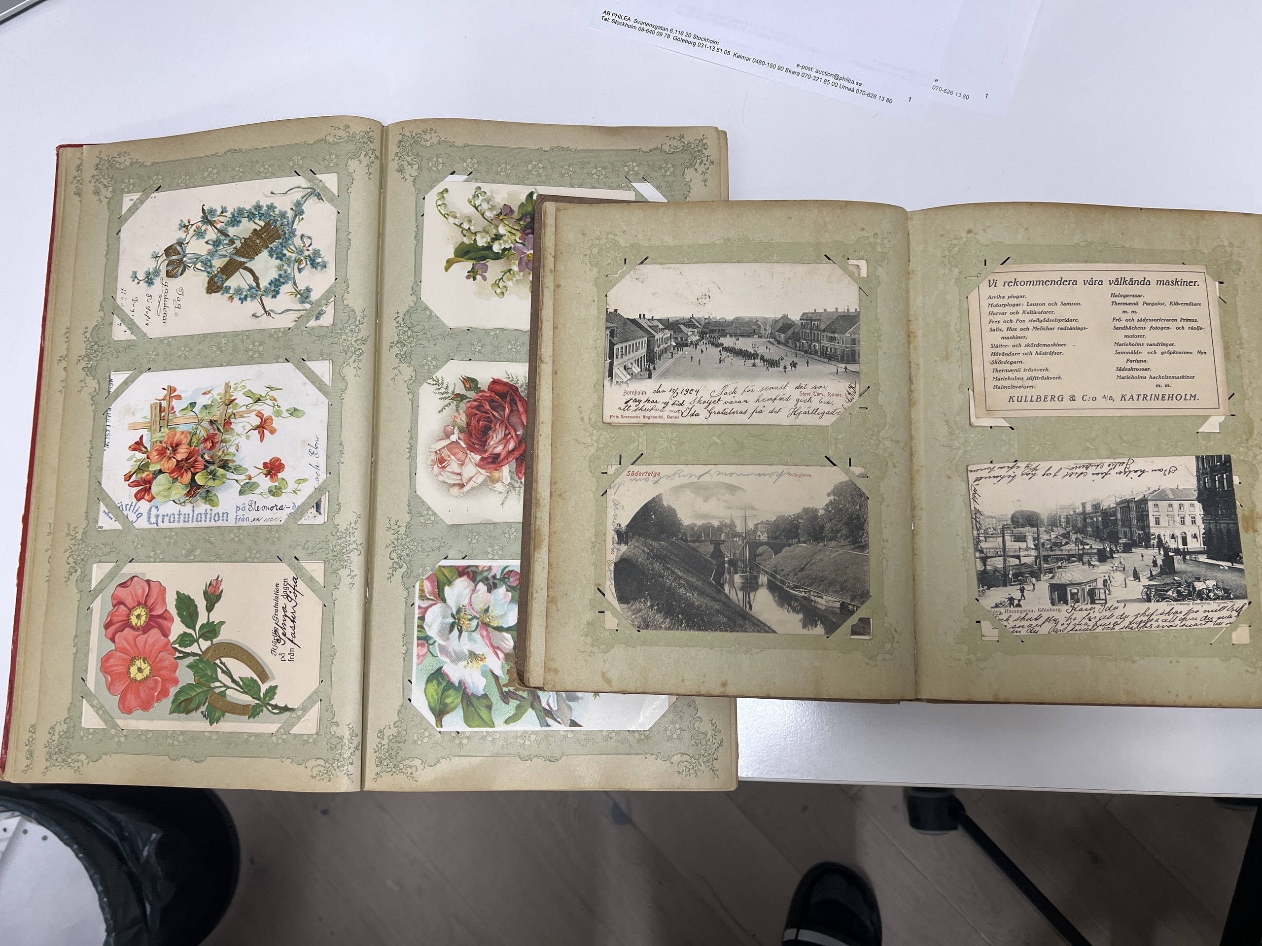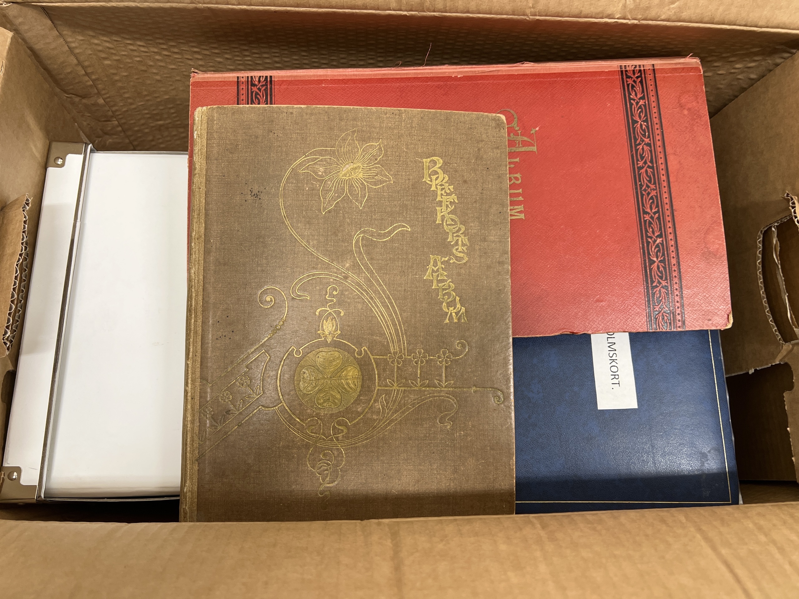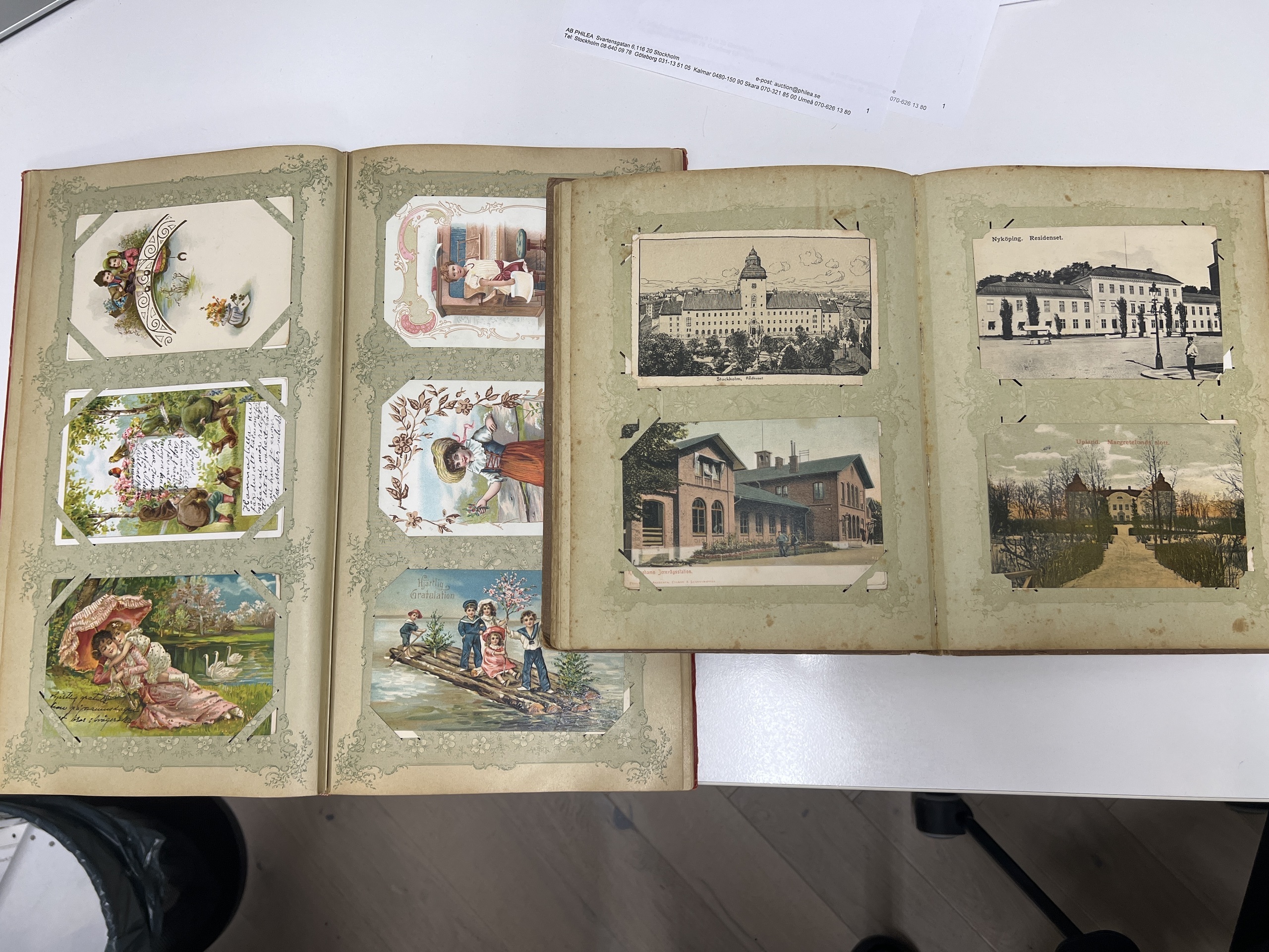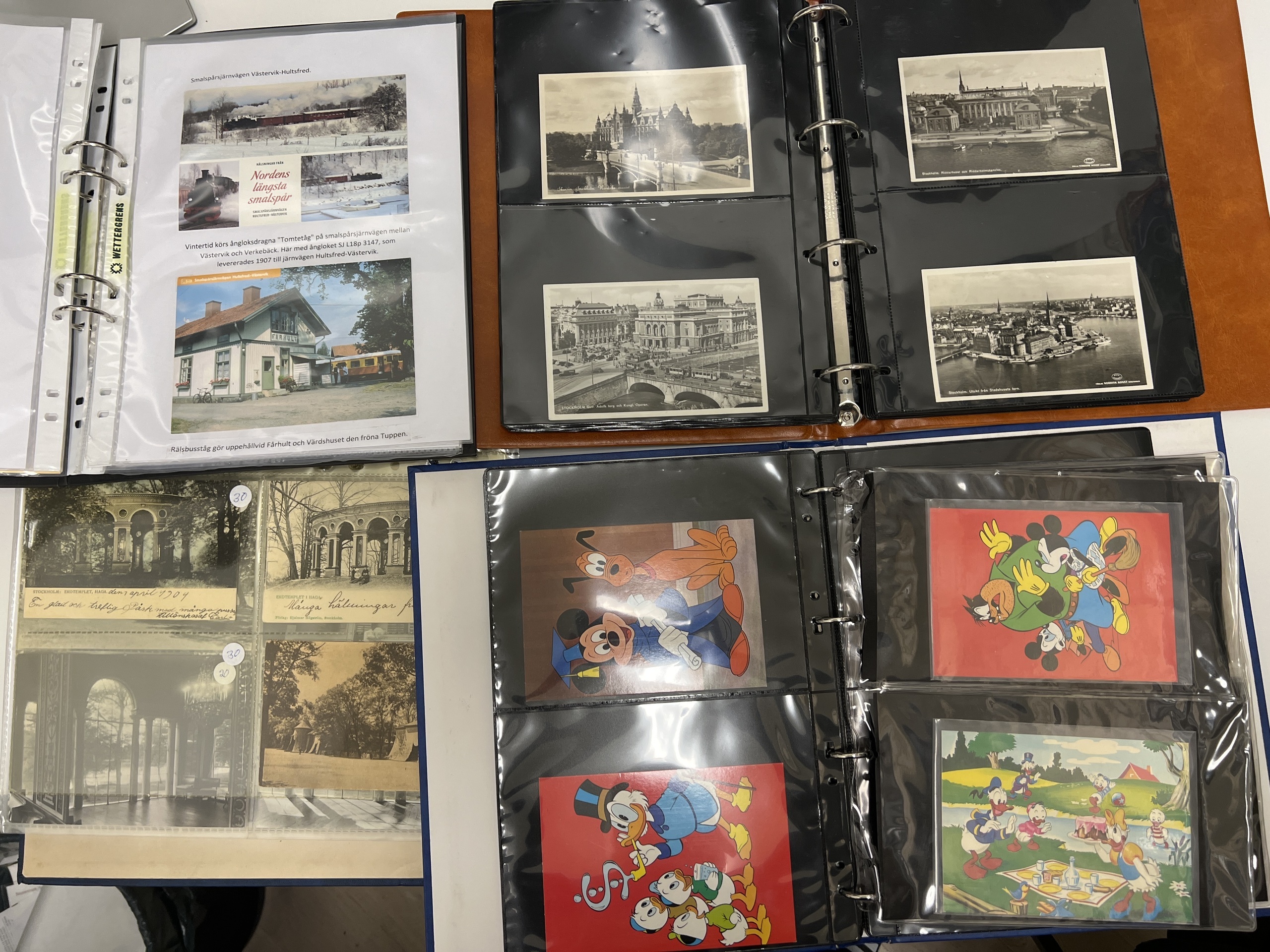 Sweden. Picture postcards, collection/accumulation in removal box in ten albums and one box, including two older albums with older cards, one with topografic, the other one with gratulationcards/signed, etc. Other albums with Stockholm, tecknade kort, and other areas. Most of the cards in 9x14 but also some albums with 10x15 cm. Please inspect. Mostly fine quality. Approx. 16 kg. (1000s)