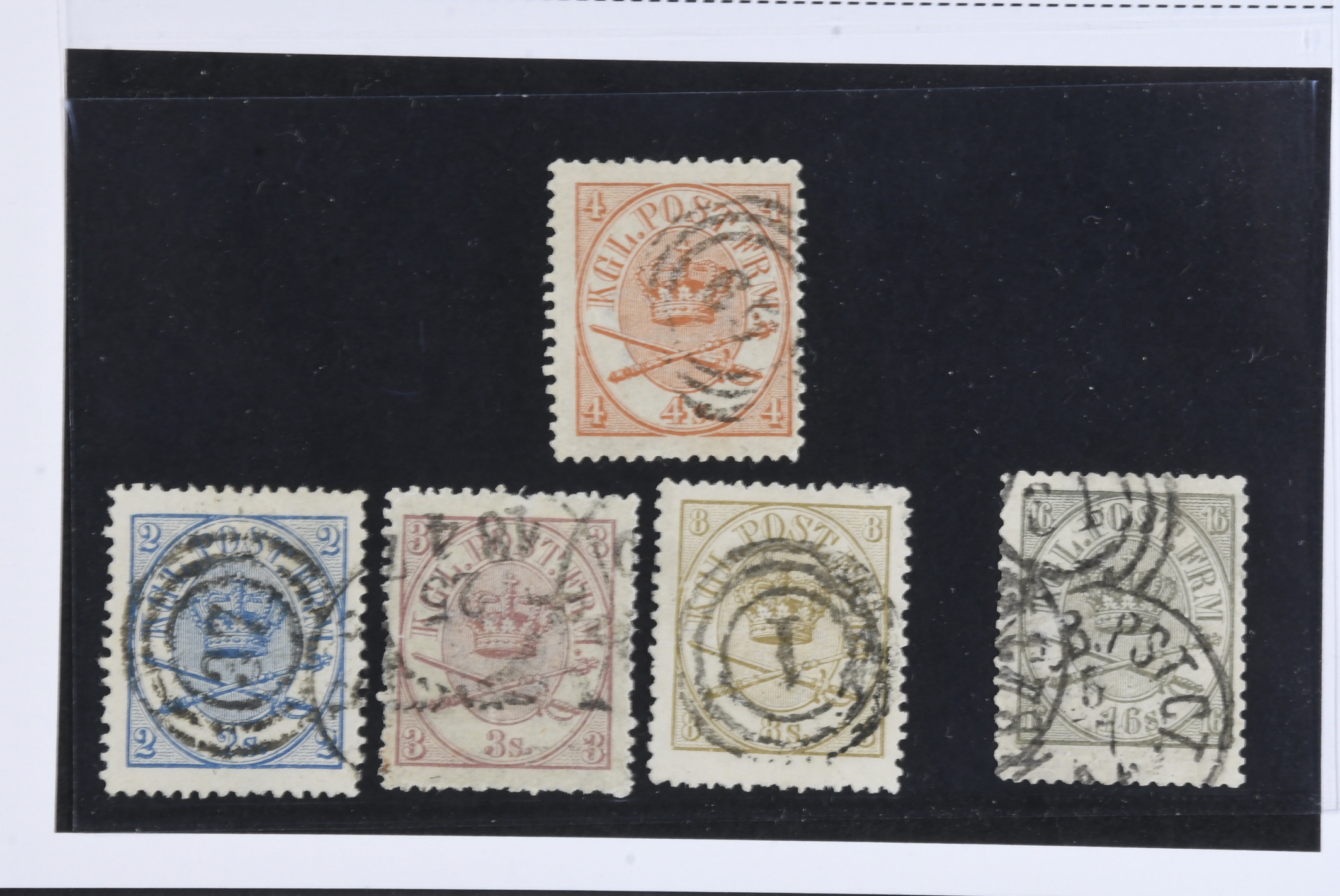 Denmark. Facit 11–15 used, 1864 Large oval type. 2–16 Skill, perf 13 × 12½. Somewhat mixed quality. SEK over 4000
