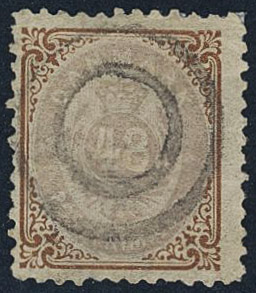 Denmark. Facit 27 used, 1870 Bi-coloured type 48 skill lilac and brown, line perf 12½. Uneven perfs. SEK 2500