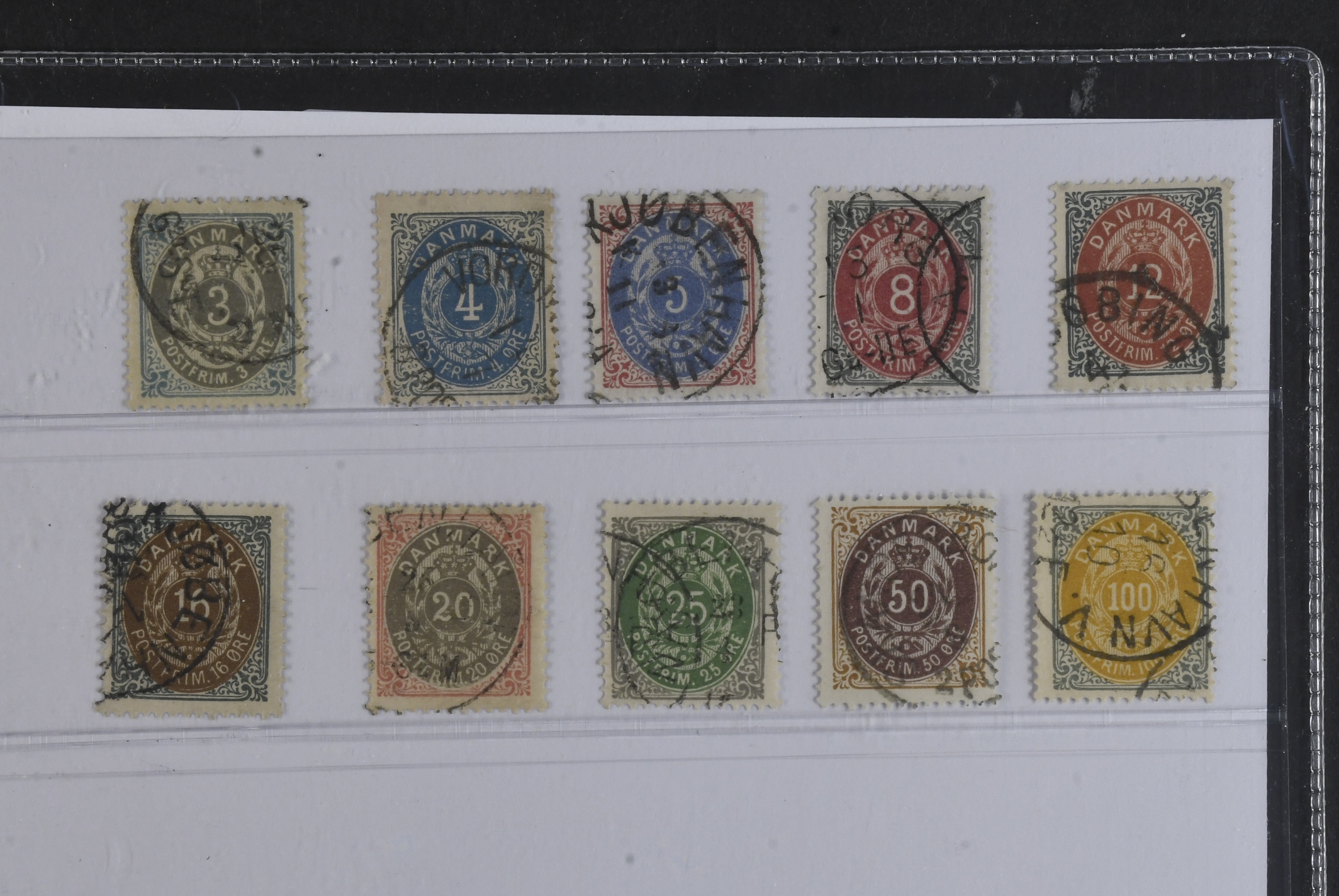 Denmark. Facit 28–37 used, 1875 Øre values 3–100 øre (ten ex). SEK ca. 2500
