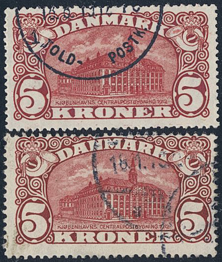 Denmark. Facit 121–22 used, 1915 GPO Copenhagen 5 Kr brown-red, watermark cross and crown (2). SEK 2800