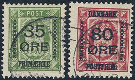 Denmark. Facit 122–23 used, 1912 Surcharge on Official stamps 35 / 32 and 80/8 øre, watermark crown (2). SEK 1900
