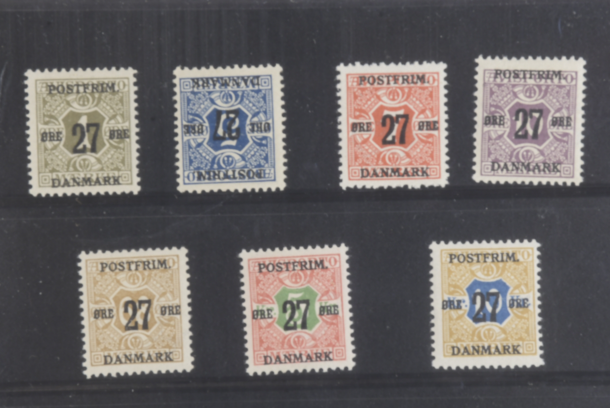 Denmark. Facit 177–83 ★★/★, 1918 Surcharge on Newspaper stamps SET watermark crown mixed very light hinged and NH (7).
