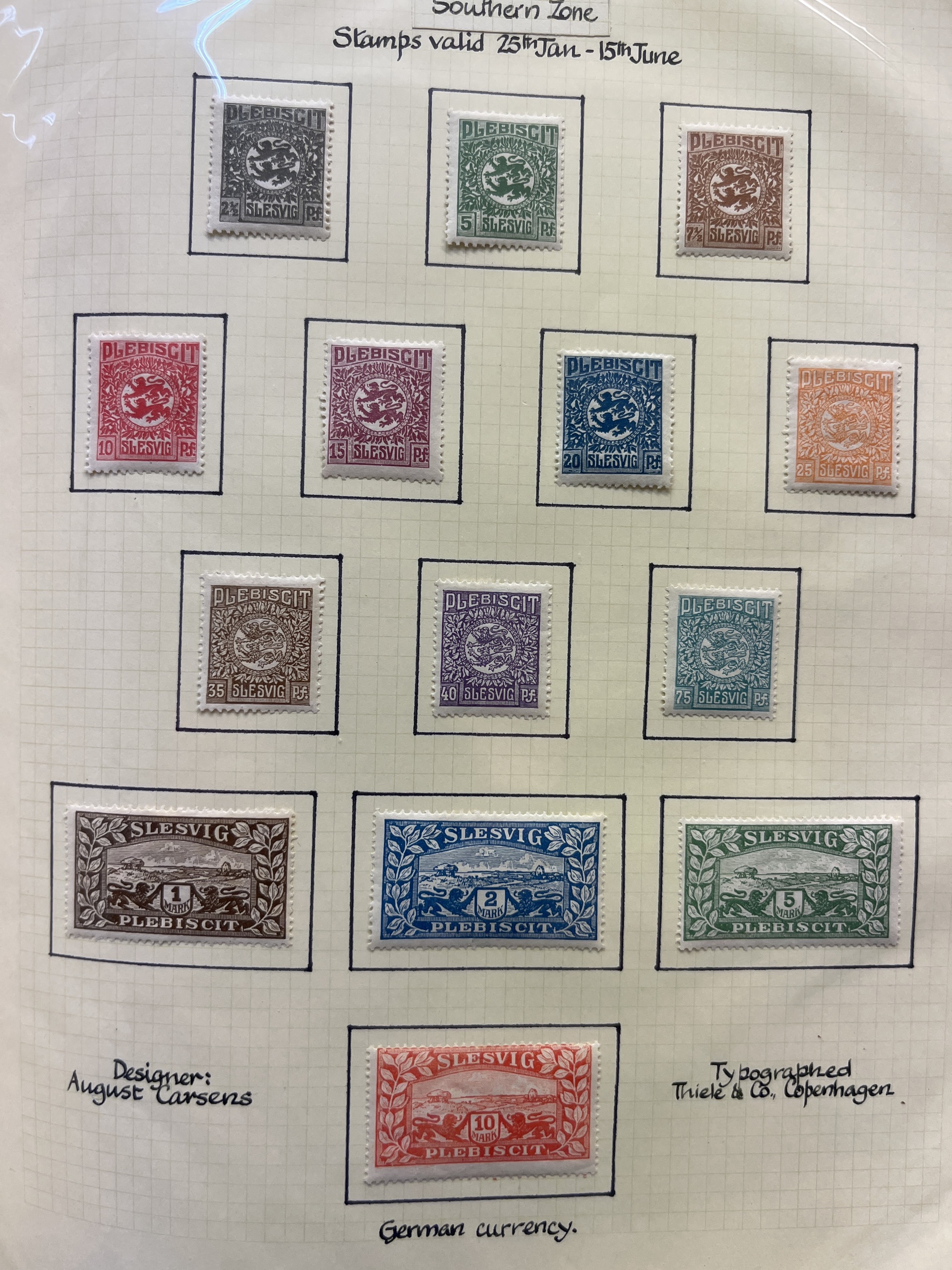 Denmark. Collection mostly used 1875–1942 in album. With e.g. shades, inverted frames, few overs, 5 kr GPO both types, HC Andersen Tete Beche set, Dybbøl Mølle block of four set (with Wavy-line typ etc, also Schleswig Holstein 1850–1868. Good quality.