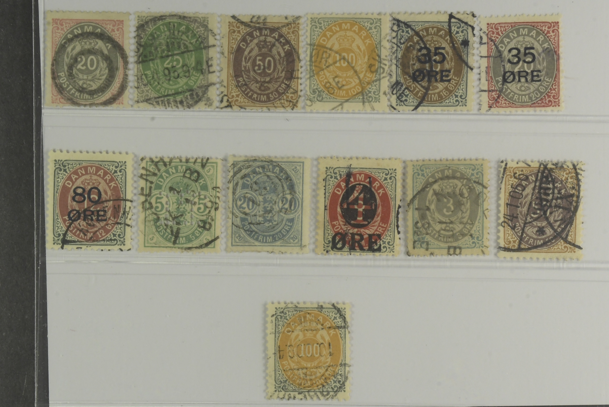 Denmark. Used 1875–1902. All different, e.g. F 34–37, 47–50, 52. Mostly good quality. F SEK 6615 (13)