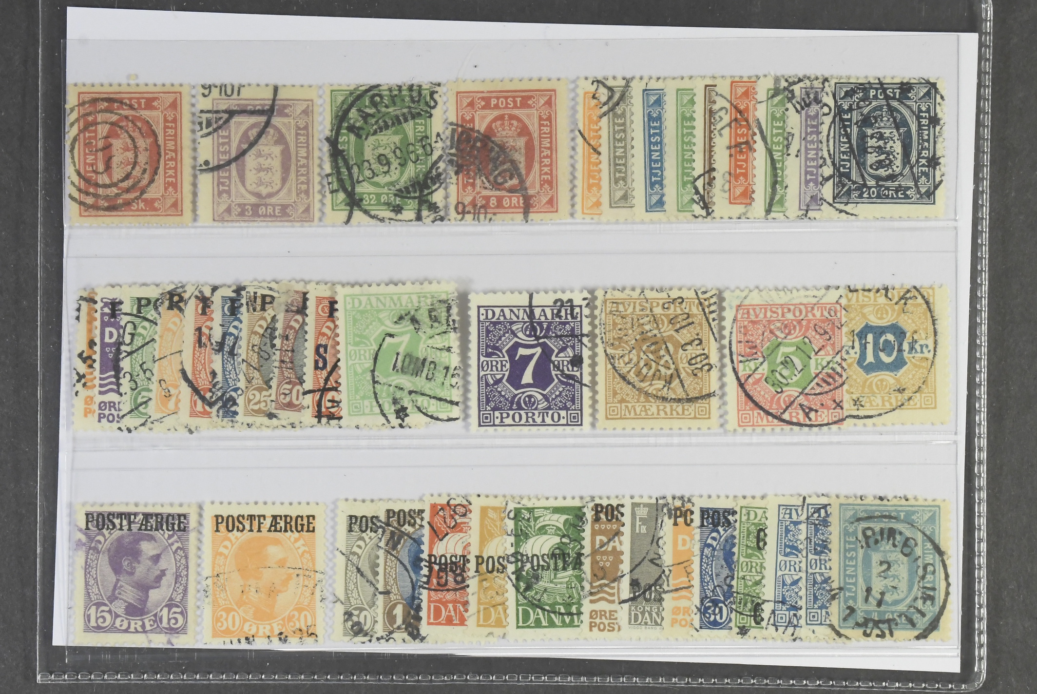 Denmark. Used 1871–1955. Back-of-the-book. All different, e.g. Tj2, Tj6, Tj9, Tj14, Tj16–24, L1–9, L14–15, TI 7, TI 9–10, PF2–3, PF6–7, PF23–25. Mostly good quality. F SEK 6885 (42)