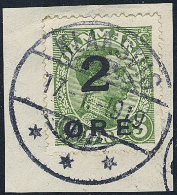 The Faroes. Facit 3 used, 1919 2 øre on 5 øre green on piece with very fine cancel KLARSVIG 17.1.1919. SEK 800