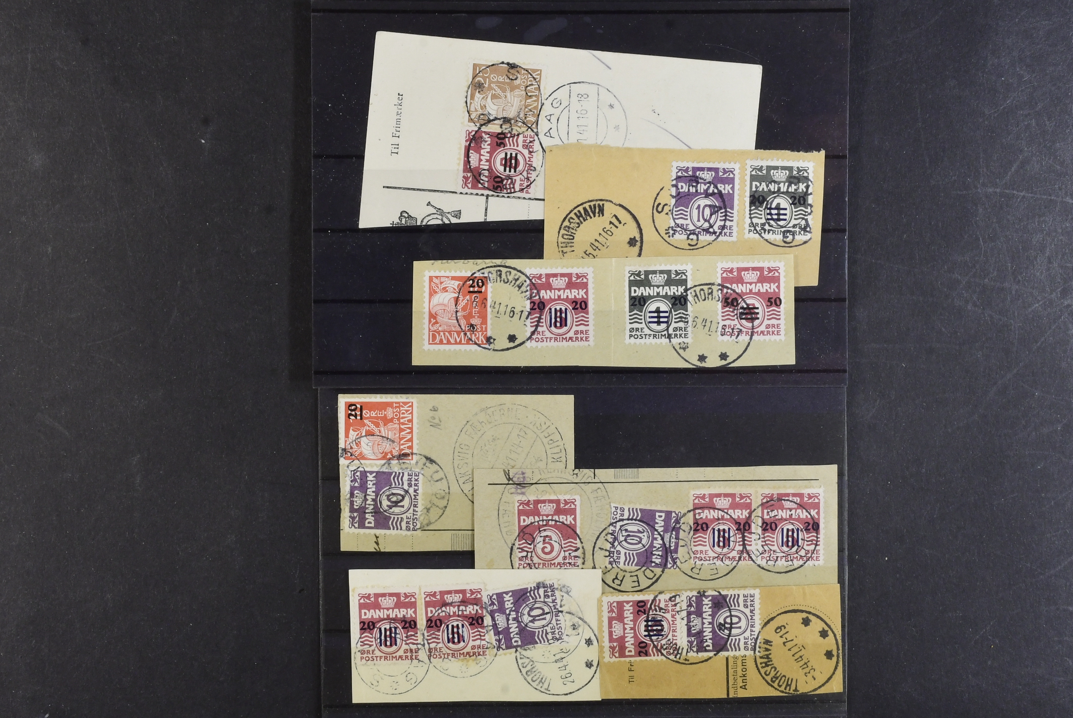 The Faroes. Used. Seven cuts with mix frank the Faroes + Denmark incl. e.g. two copies F4 and two pairs F5, etc. F 5200++. The entire lot is presented at www.philea.se.