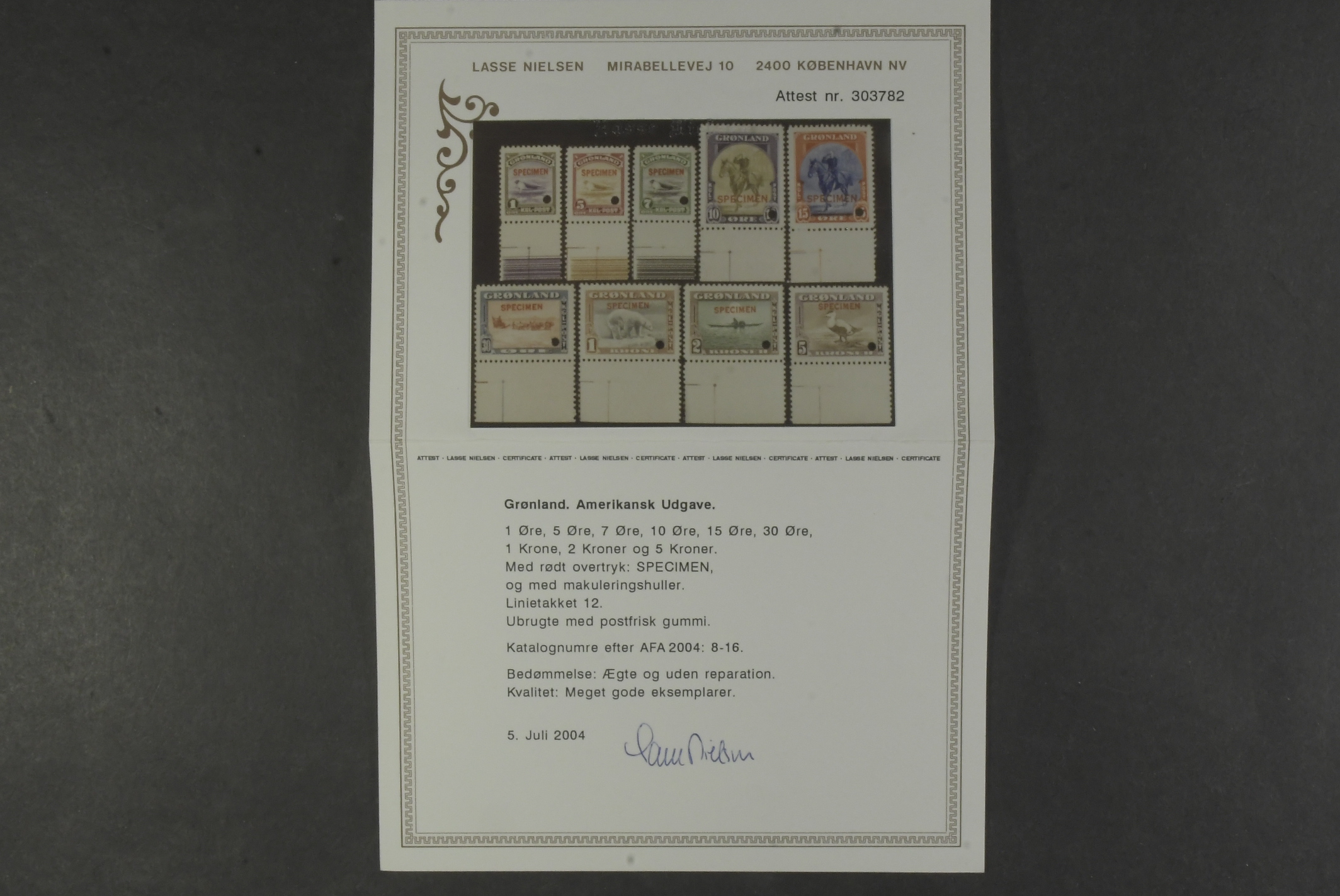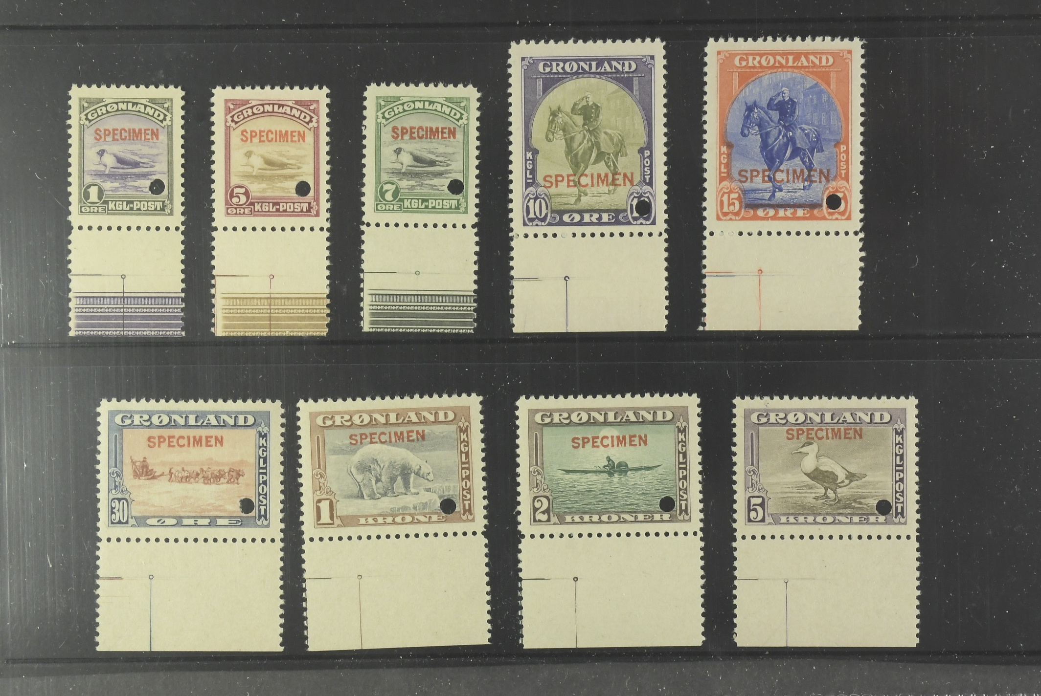 Greenland. Facit 10–18 ★★, 1945 Various designs. Complete set (9) with red overprints 'SPECIMEN' and punch holes. EXTREMELY RARE. Cert. Lasse Nielsen.