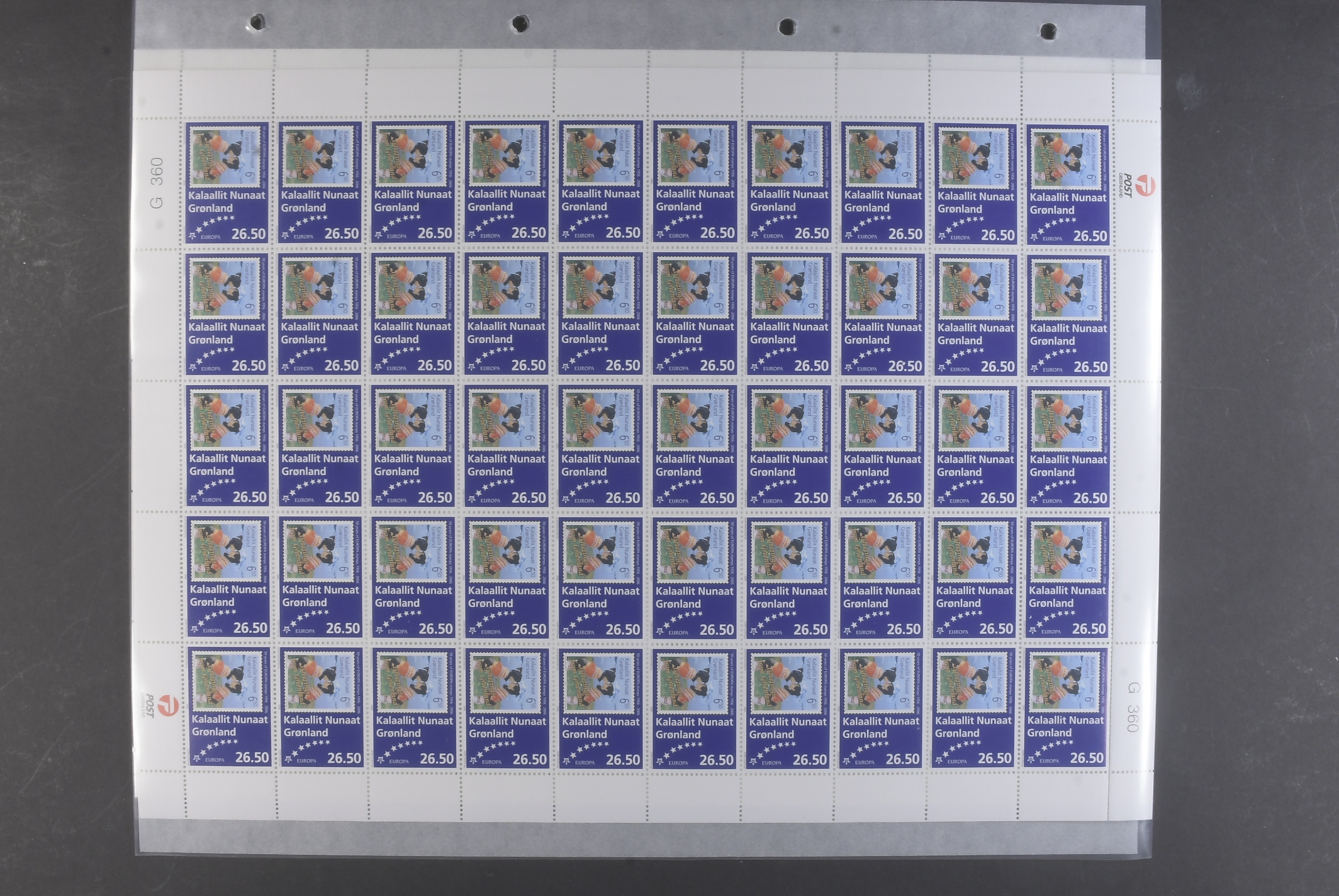Greenland. Facit 448 ★★, 2006 50th anniversary of Europa stamps 26.50 kr (1). Lot with 20 full sheets of fifty stamps. Face value DKK 26500.