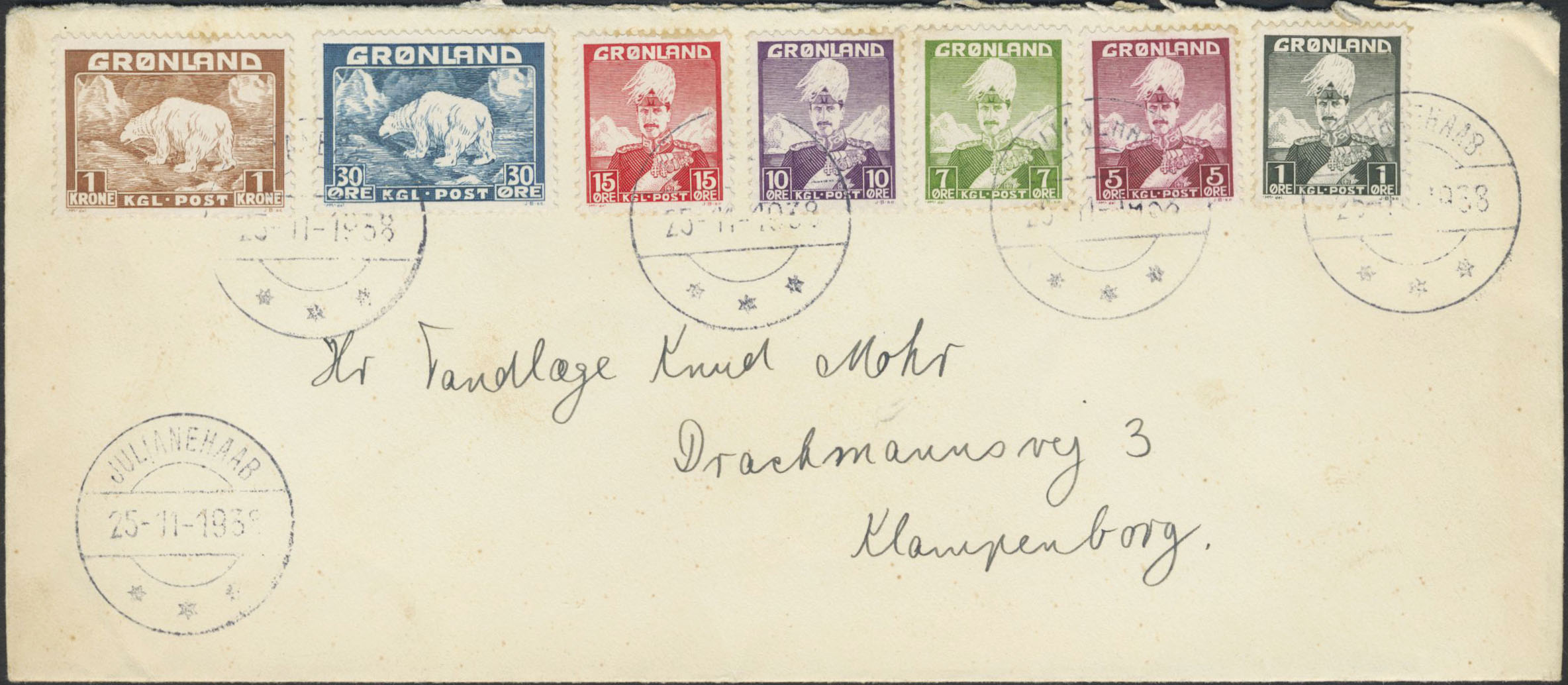 Greenland. FDC, Facit 1–5, 7, 9, 1938 Christian X and Polarbear Julianehaab 25.11.1938.