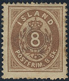 Iceland. Facit 3 ★, 1873 Skilding values 8 sk brown, perf 14 × 13½. Somewhat climate affected. SEK 3000