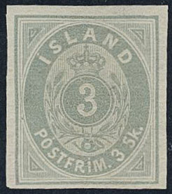 Iceland. Facit 5v2 (★), 1873 Skilding values 3 sk grey, imperf without gum. Signed Engel. SEK 6500