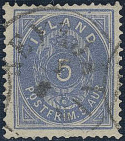 Iceland. Facit 9 used, 1878 Aur values 5 aur blue, perf 14 × 13½. SEK 8500