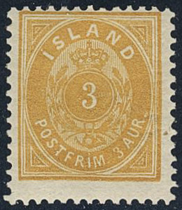 Iceland. Facit 20 ★★, 1897 Aur values 3 aur orange, small “3” perf 12¾. Almost off-centered. SEK 3600
