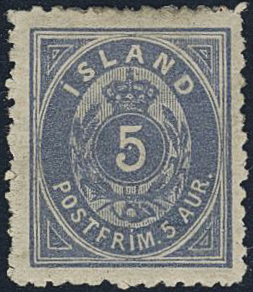 Iceland. Facit 23 ★, 1876 Aur values 5 aur blue-grey, rough perf 12¾. SEK 3500