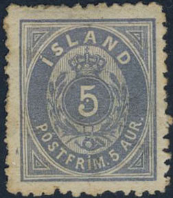 Iceland. Facit 23 ★, 1876 Aur values 5 aur blue-grey, rough perf 12¾. Uneven perf. SEK 3500