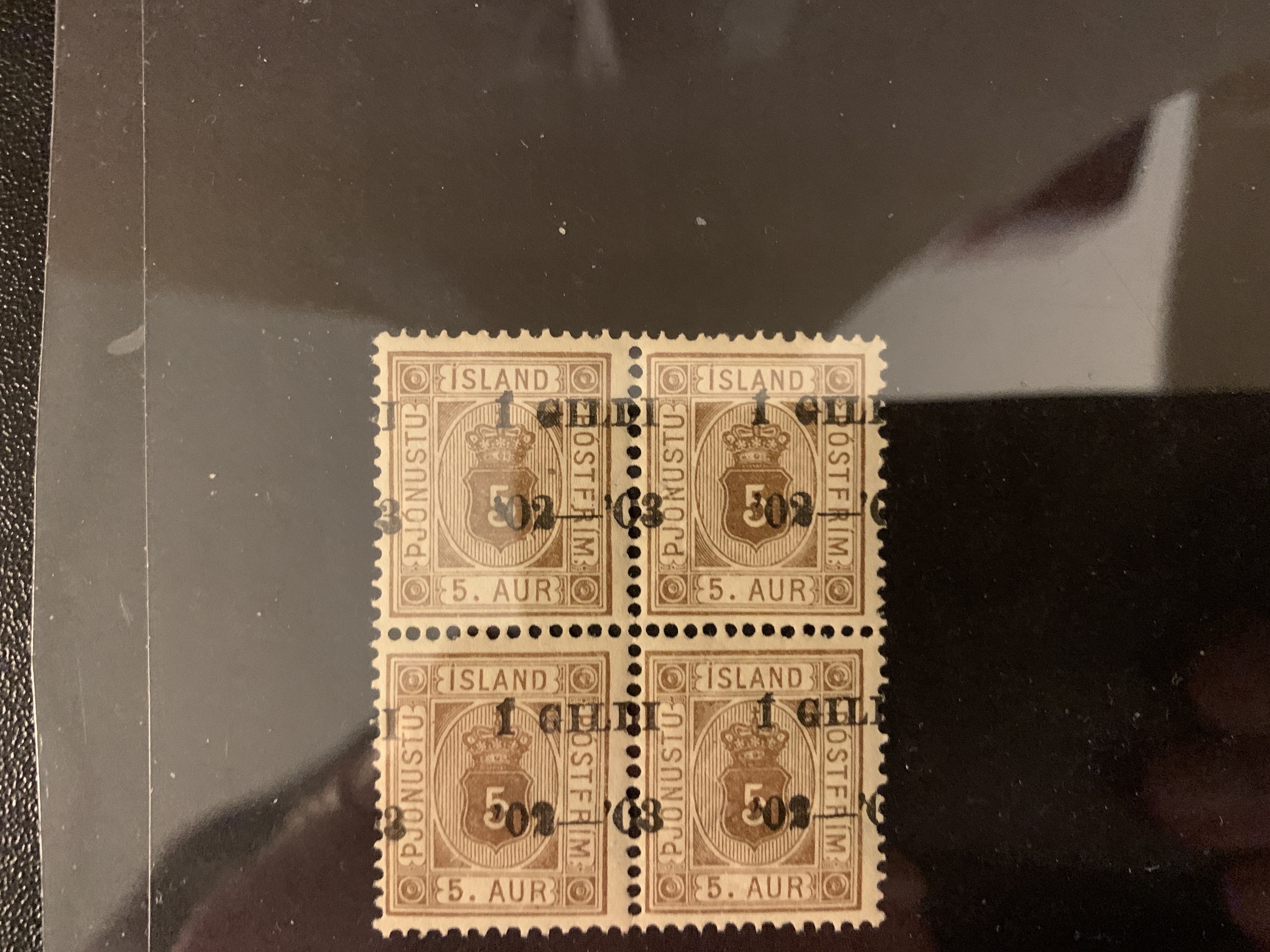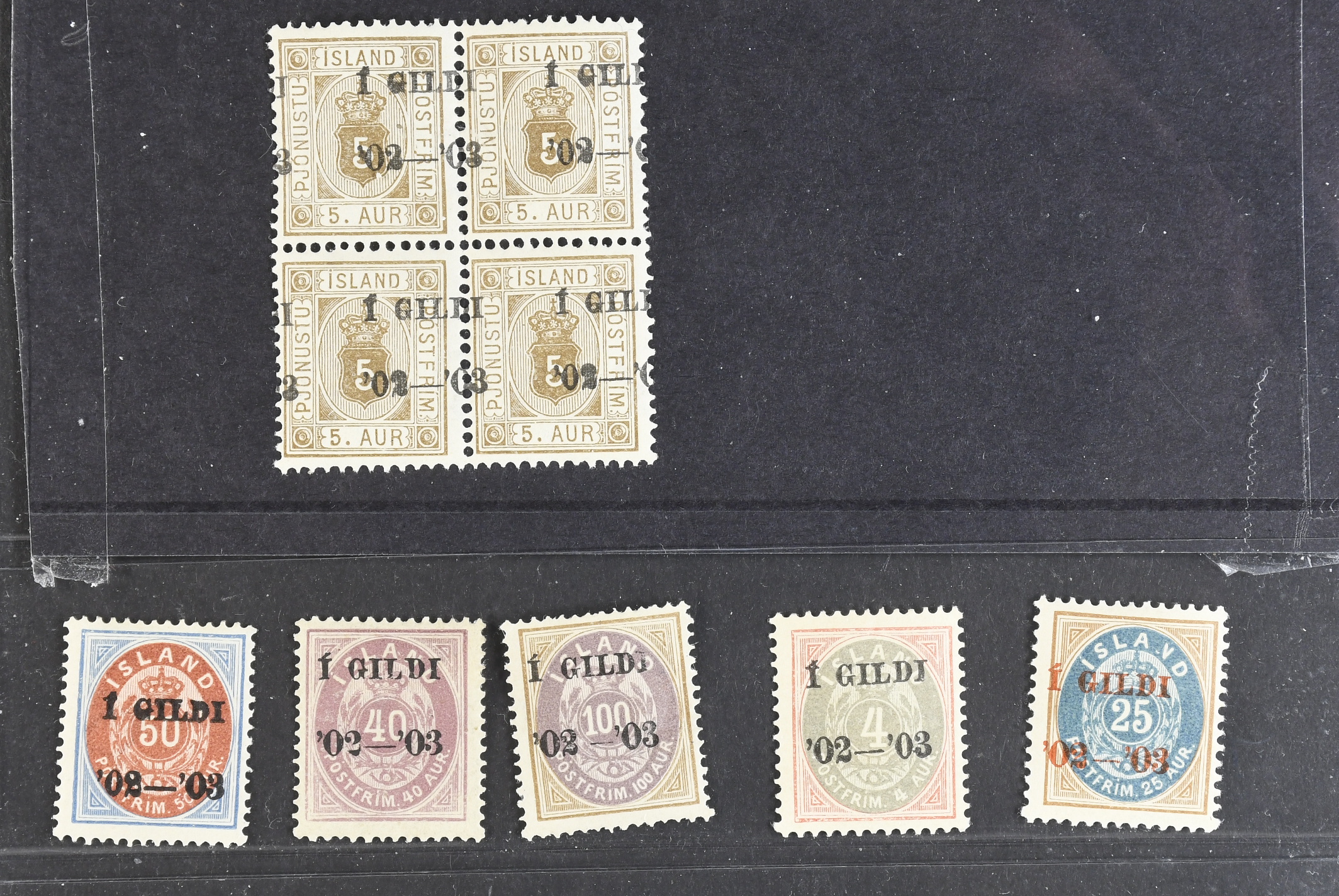 Iceland. Facit 44, etc. ★, 1902 Surcharge “Í GILDI” 100 aur lilac/brown, perf 14 × 13½, black overprint etc. unused and unmounted mint I gildi and official stamps. SEK More than 2000