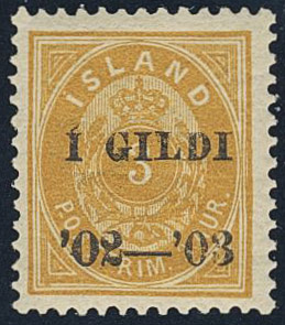 Iceland. Facit 48 ★★, 1902 Surcharge “Í GILDI” 3 aur yellow, small “3”, perf 12¾, black overprint. Good centering. SEK 6000