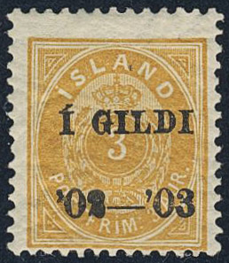 Iceland. Facit 48 ★, 1902 Surcharge “Í GILDI” 3 aur yellow, small “3”, perf 12¾, black overprint. Almost off-centered. SEK 2200