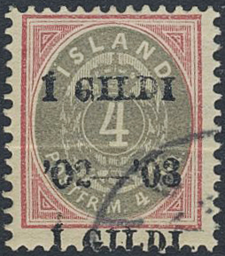 Iceland. Facit 50 used, 1902 Surcharge “Í GILDI” 4 aur grey/red, perf 12¾, black shifted overprint downwards variety. Creased.