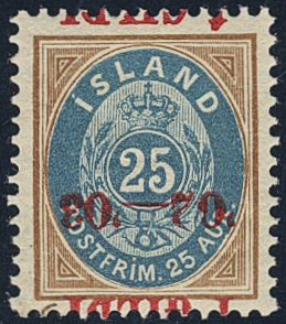 Iceland. Facit 62v1 ★★, 1902 Surcharge “Í GILDI” 25 aur blue/brown perf 12¾, red inverted overprint. Perfect centering. SEK ?