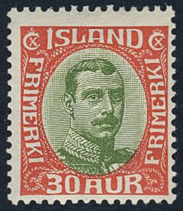 Iceland. Facit 138 ★★, 1920 King Christian X 30 aur green/red thin, broken lines. Fair centering. SEK 2400