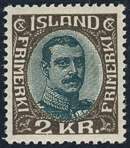 Iceland. Facit 143 ★, 1920 King Christian X 2 Kr grey-green/dark-brown thin, broken lines. Perfect centering. SEK 2000