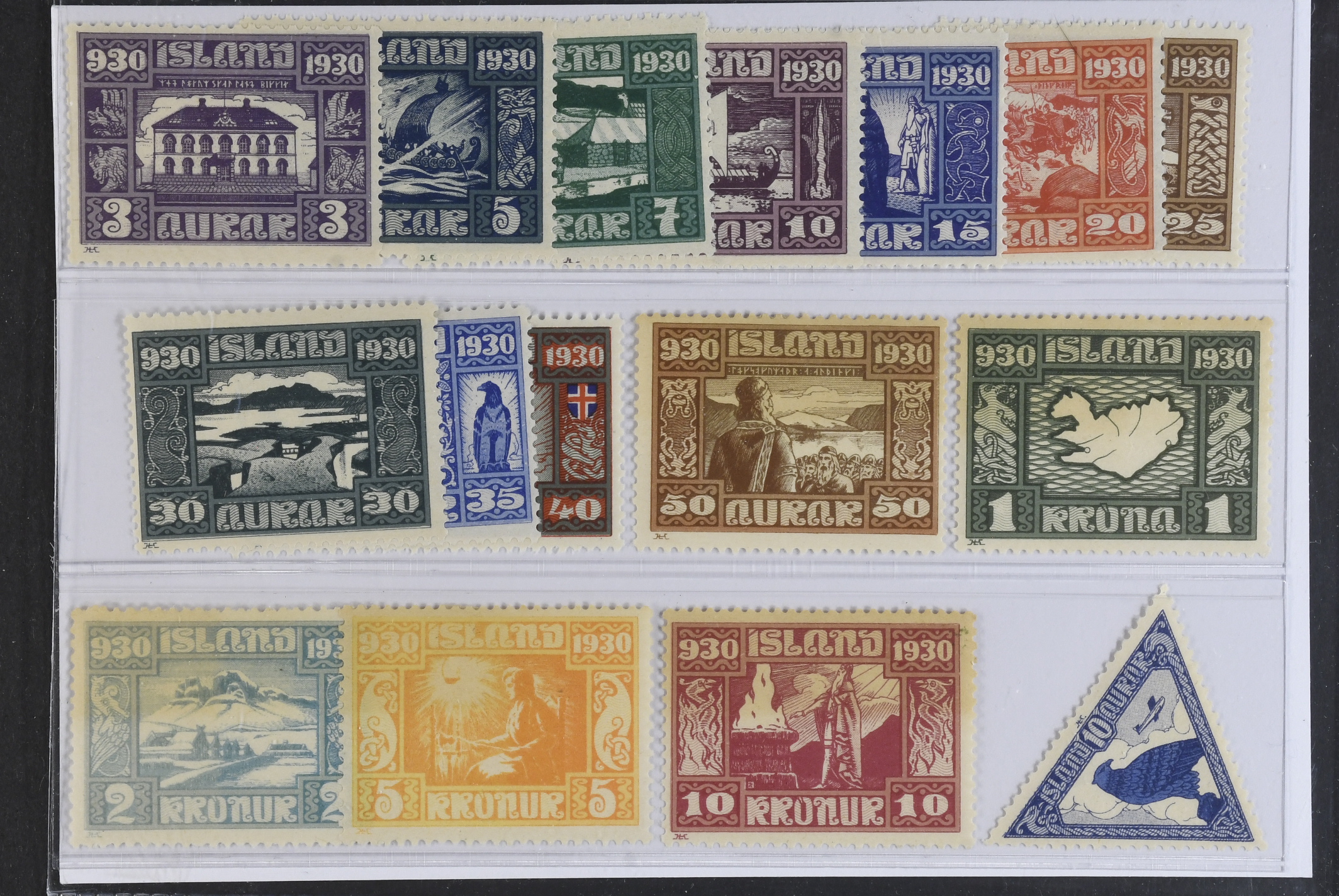 Iceland. Facit 173–88 ★, 1930 The Parliament SET (16). Some low values **, but all important values are * and 2–10 kr stained.