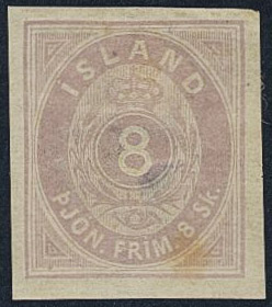 Iceland. Official Facit Tj2v1 ★, 1873 Number in frame 8 sk lilac imperf. SEK 5000