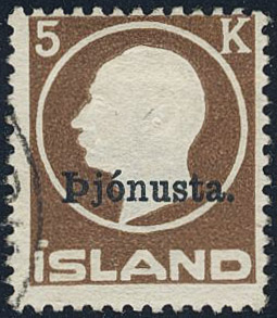 Iceland. Official Facit Tj54 used, 1922 Surcharge Þjonusta 5 Kr brown. Small part of cancel. SEK 2200