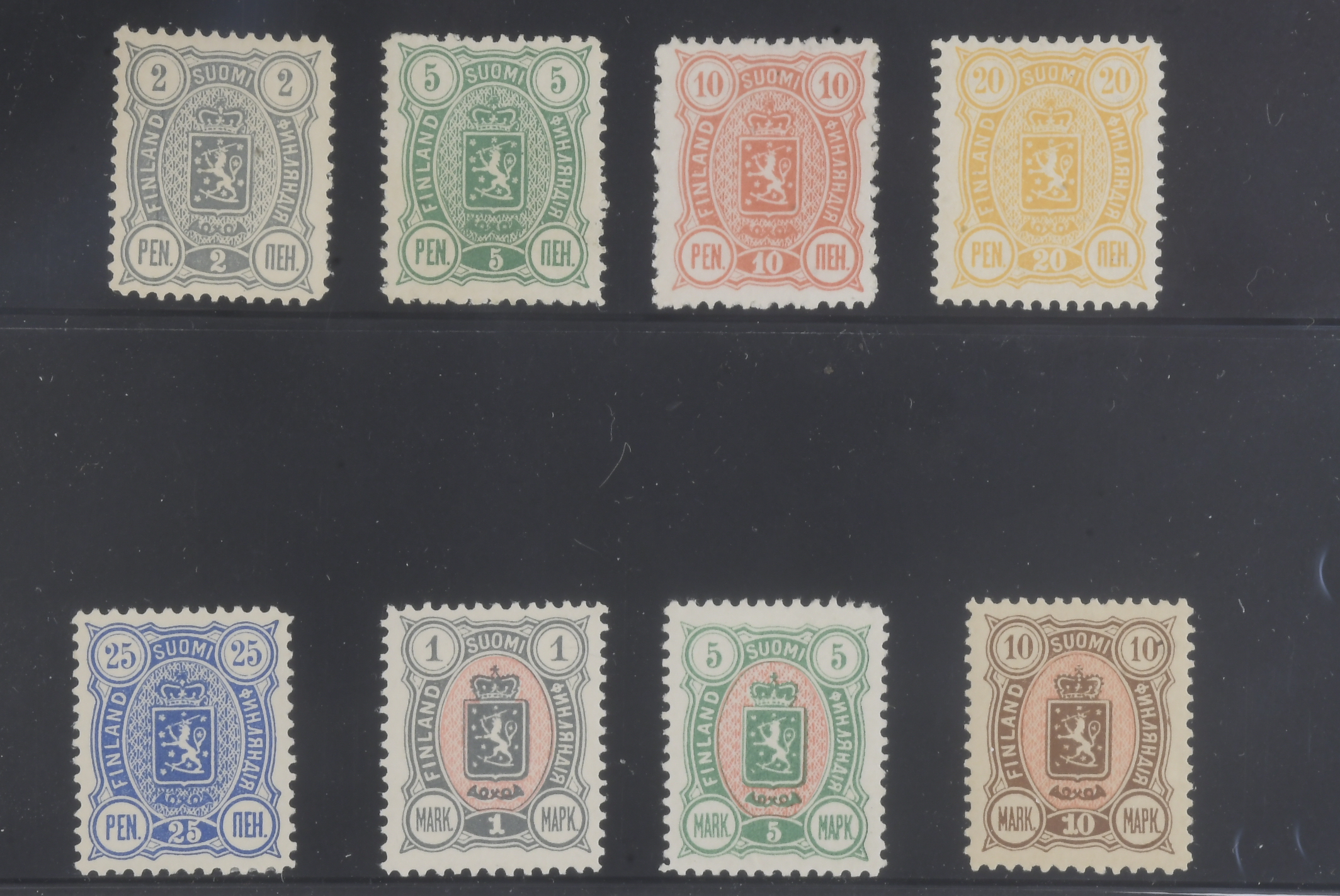 Finland. Facit 27–34 ★, 1890 Coat of Arms. Complete set perf. 12½, 10M with toned gum.