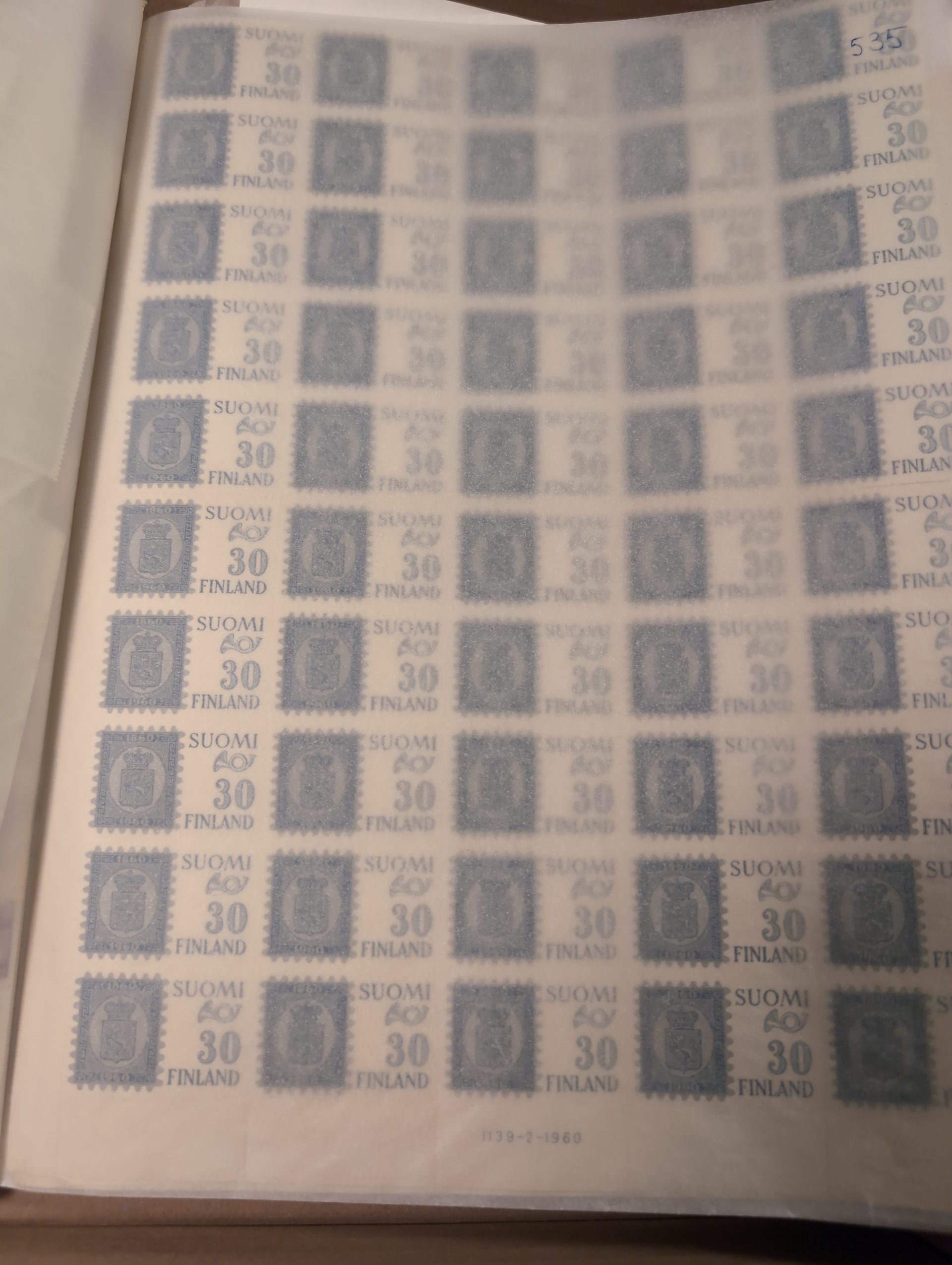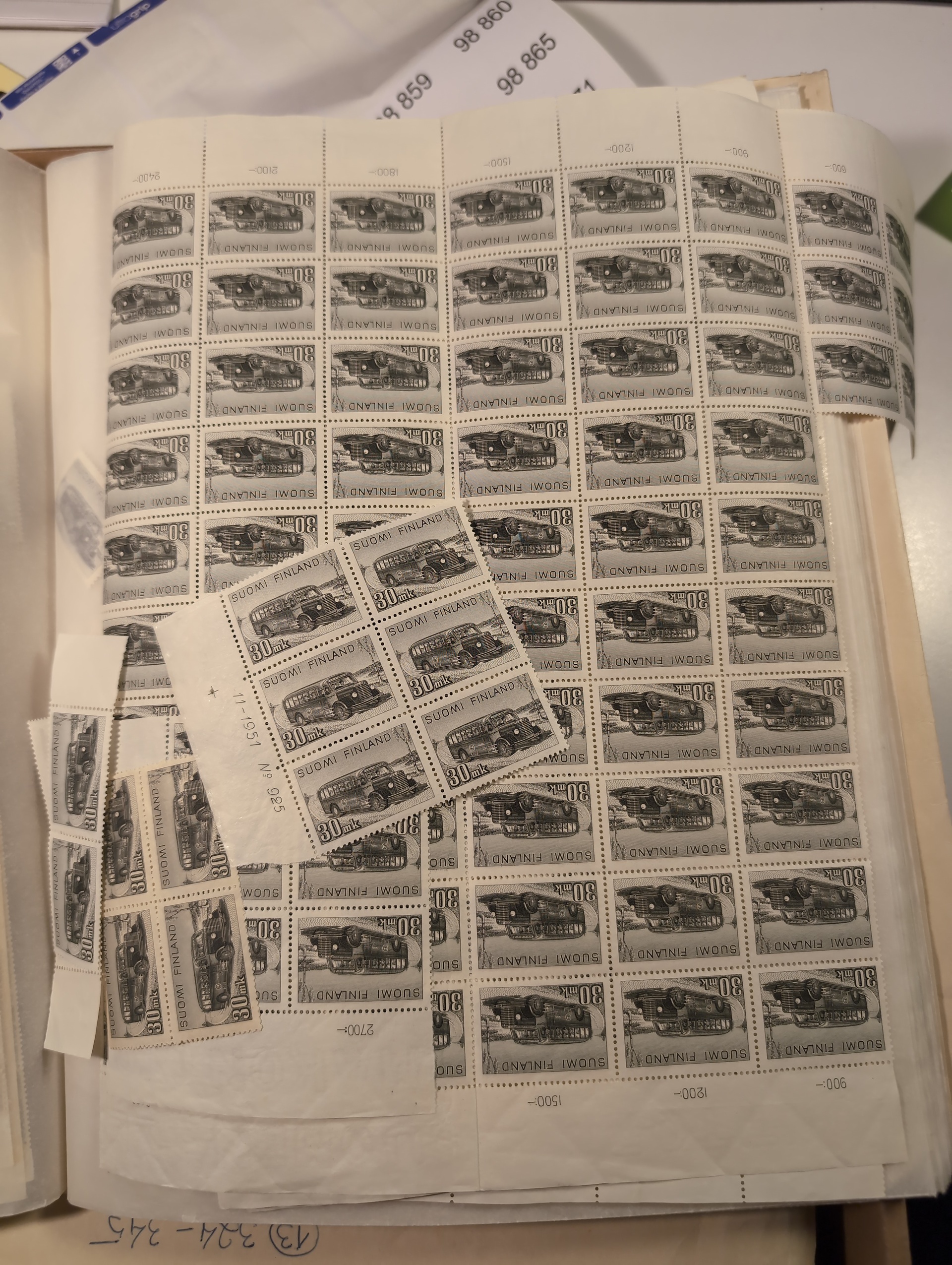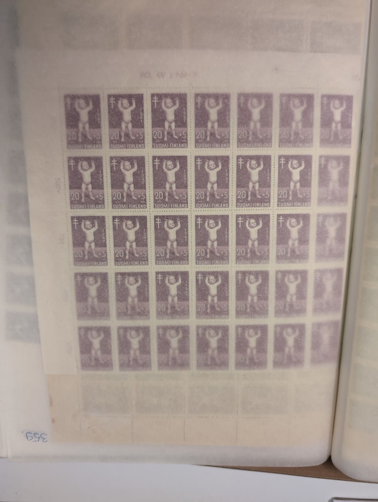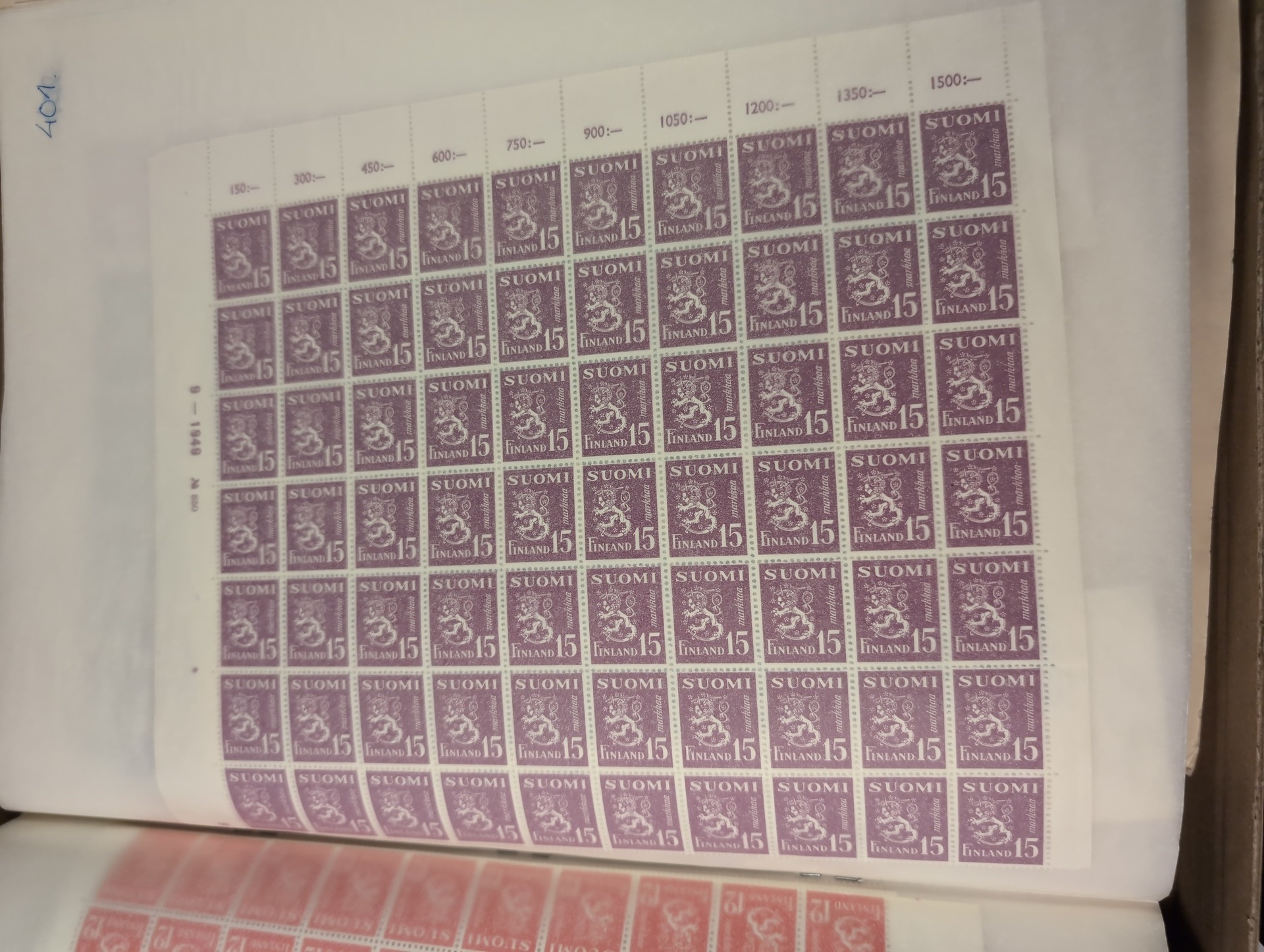 Finland. Accumulation ★★ 1944–1976 in box. Dealers stock Norma 302//579, 770//813, in sheets and parts of sheets incl. some better definitives. Huge cat value. Please see a selection of scans at www.philea.se. Mostly fine quality. Approx. 14 kg. (many 1000s)