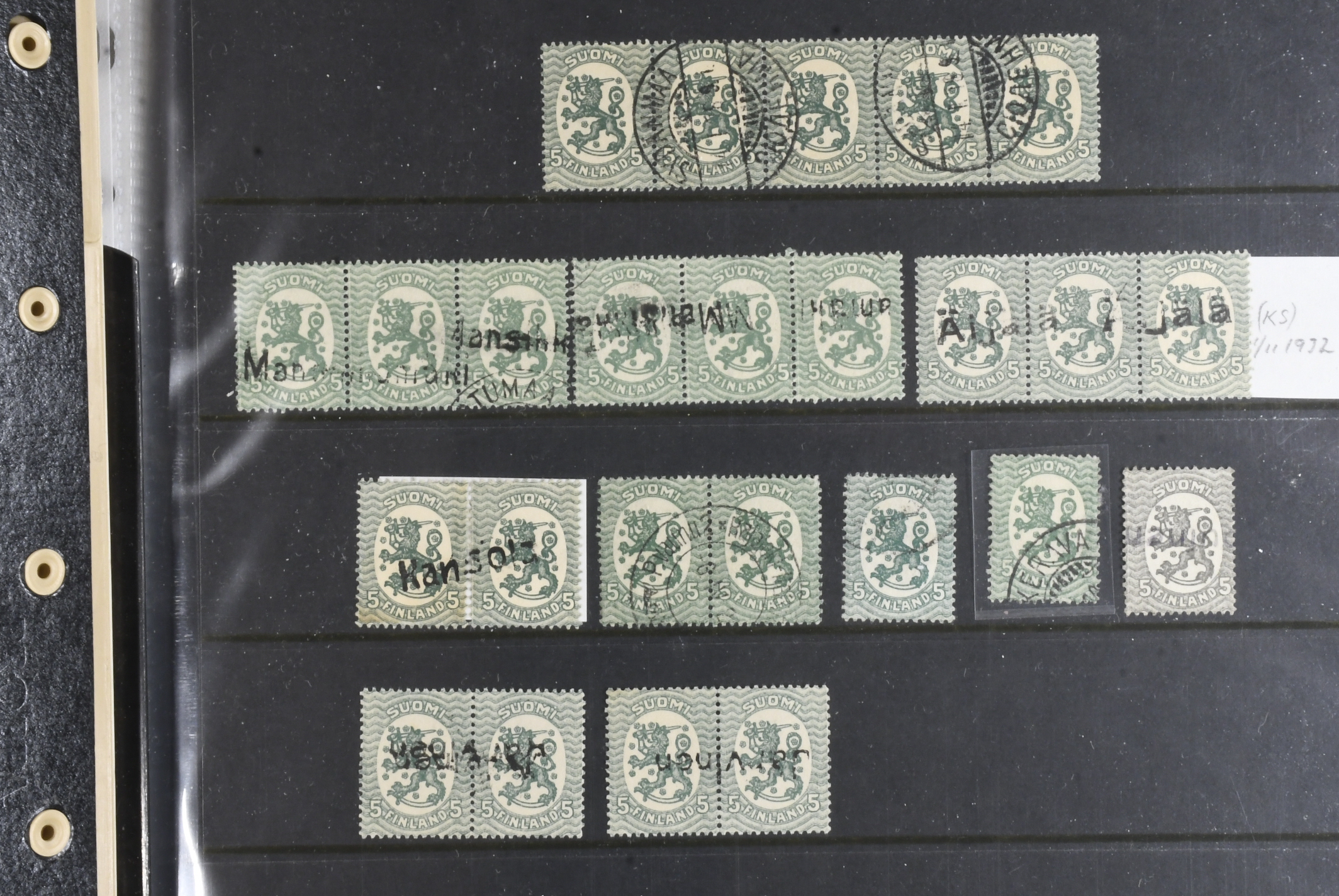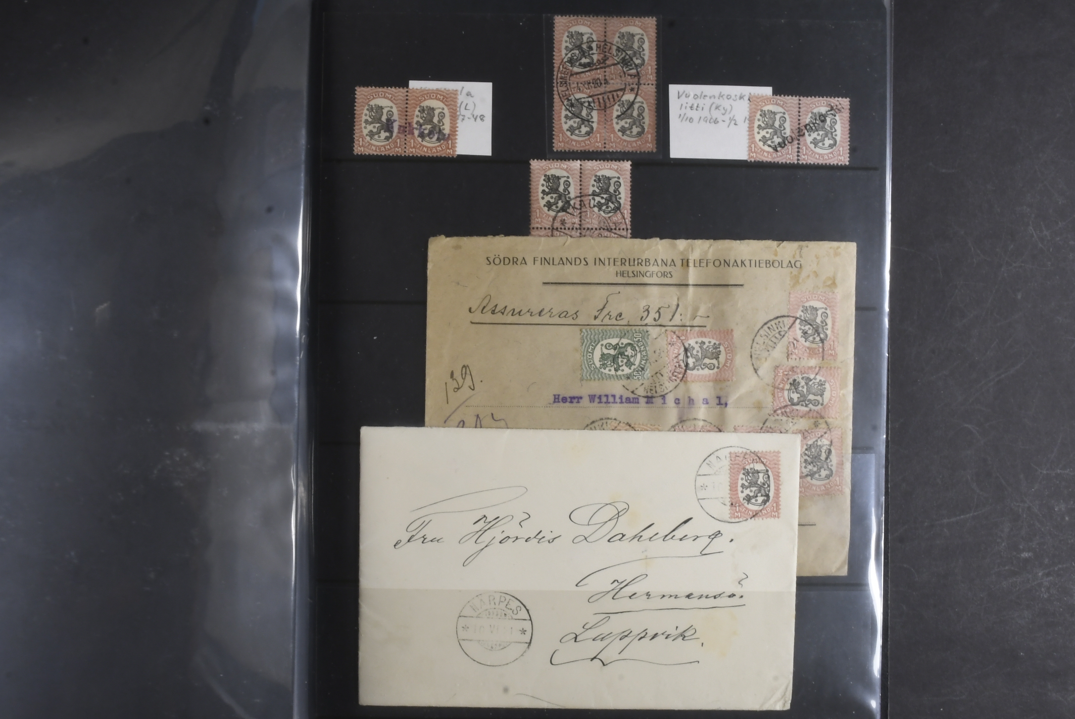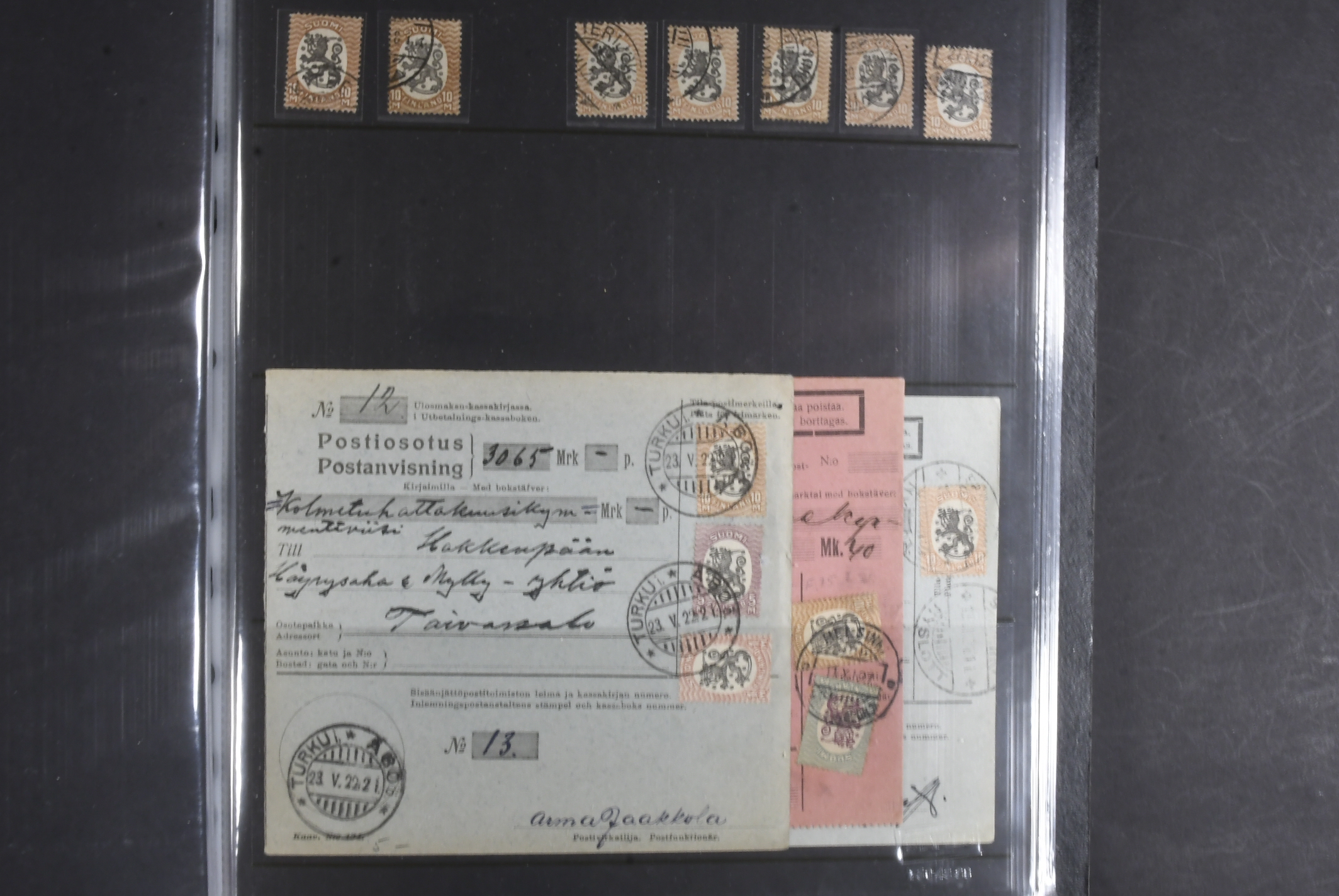 Finland. Collection/accumulation mostly used 1917–1930 in album. "Saarinen Issue" without watermark. Study material incl. single stamps, strips, blocks, etc and with different cancellations. Also a number of letters/covers both domestic and with destinations overseas in the material. Please see a selection of scans at www.philea.se. Mostly fine quality. (>300)