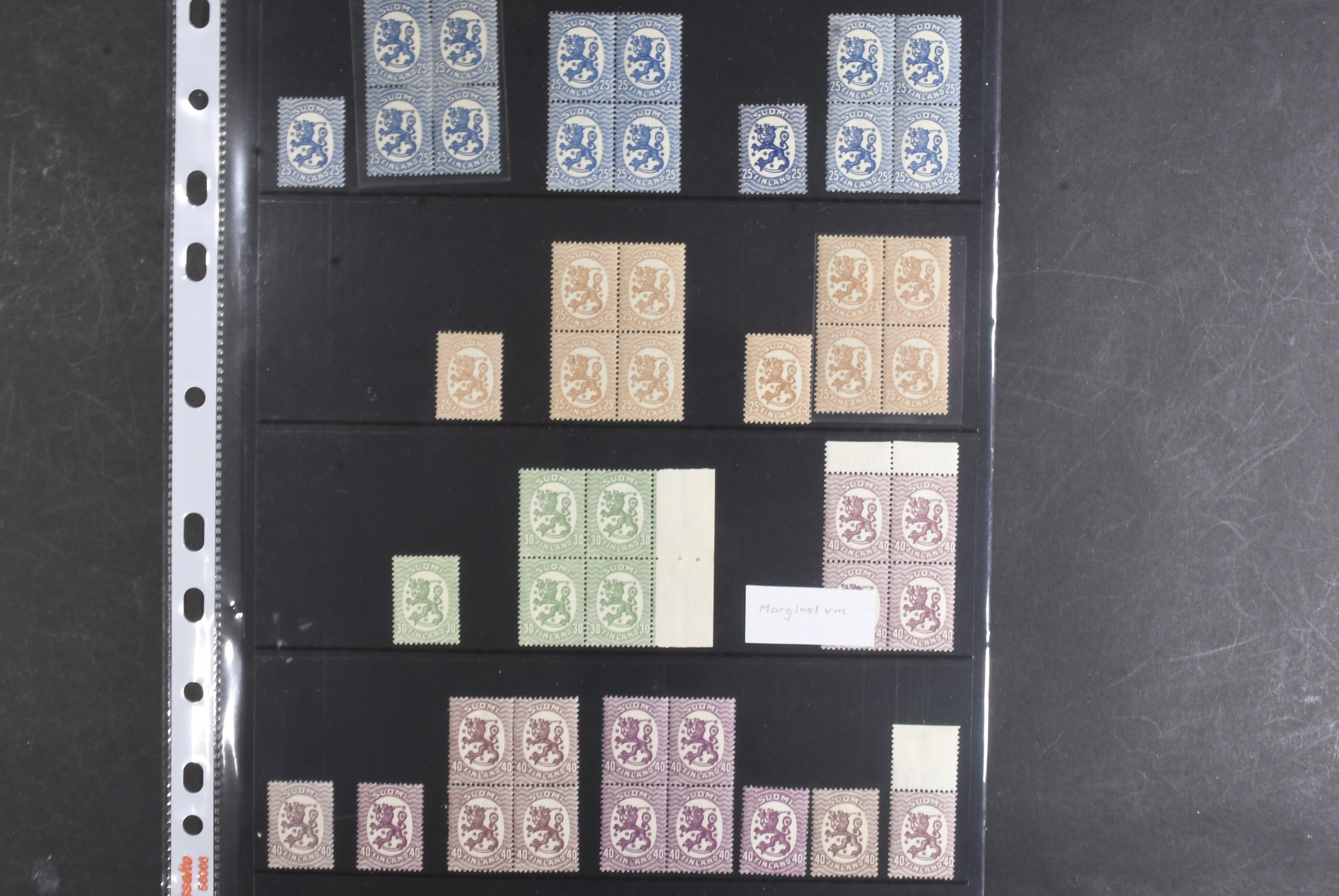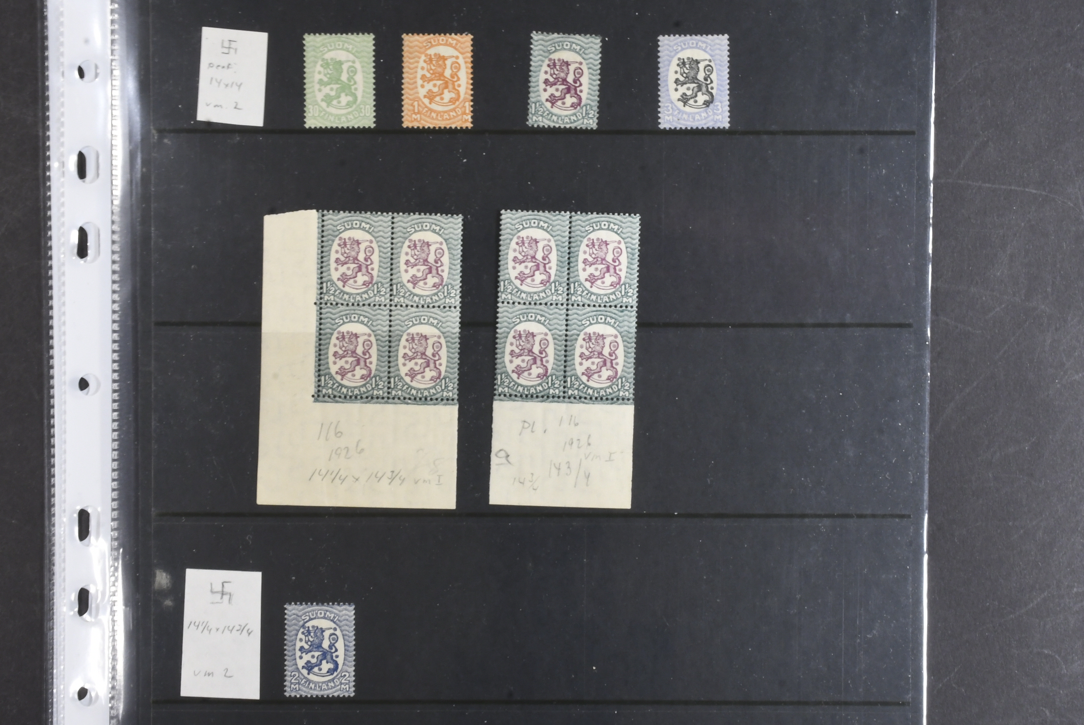 Finland. Accumulation ★★ 1917–1930 on visir leaves. Definitive series I. Single stamps, series, sets, blocks with and without margins, different watermarks etc. In total 18 album leaves. Additionally nine complete stamp sheets from this issue. As extra, six complete stamp sheets from the issue Definitive series III. Please see a selection of scans at www.philea.se. Fine quality.