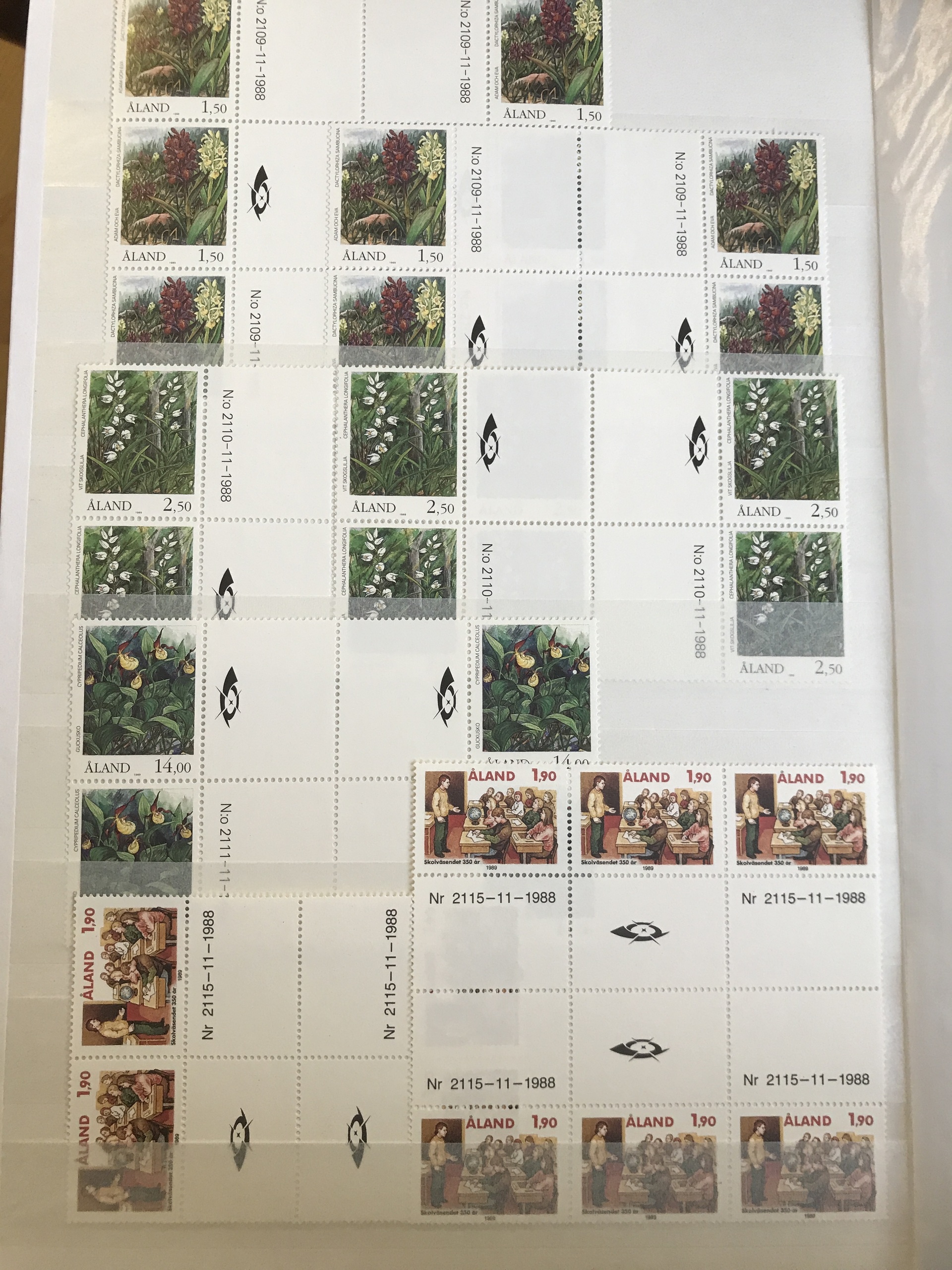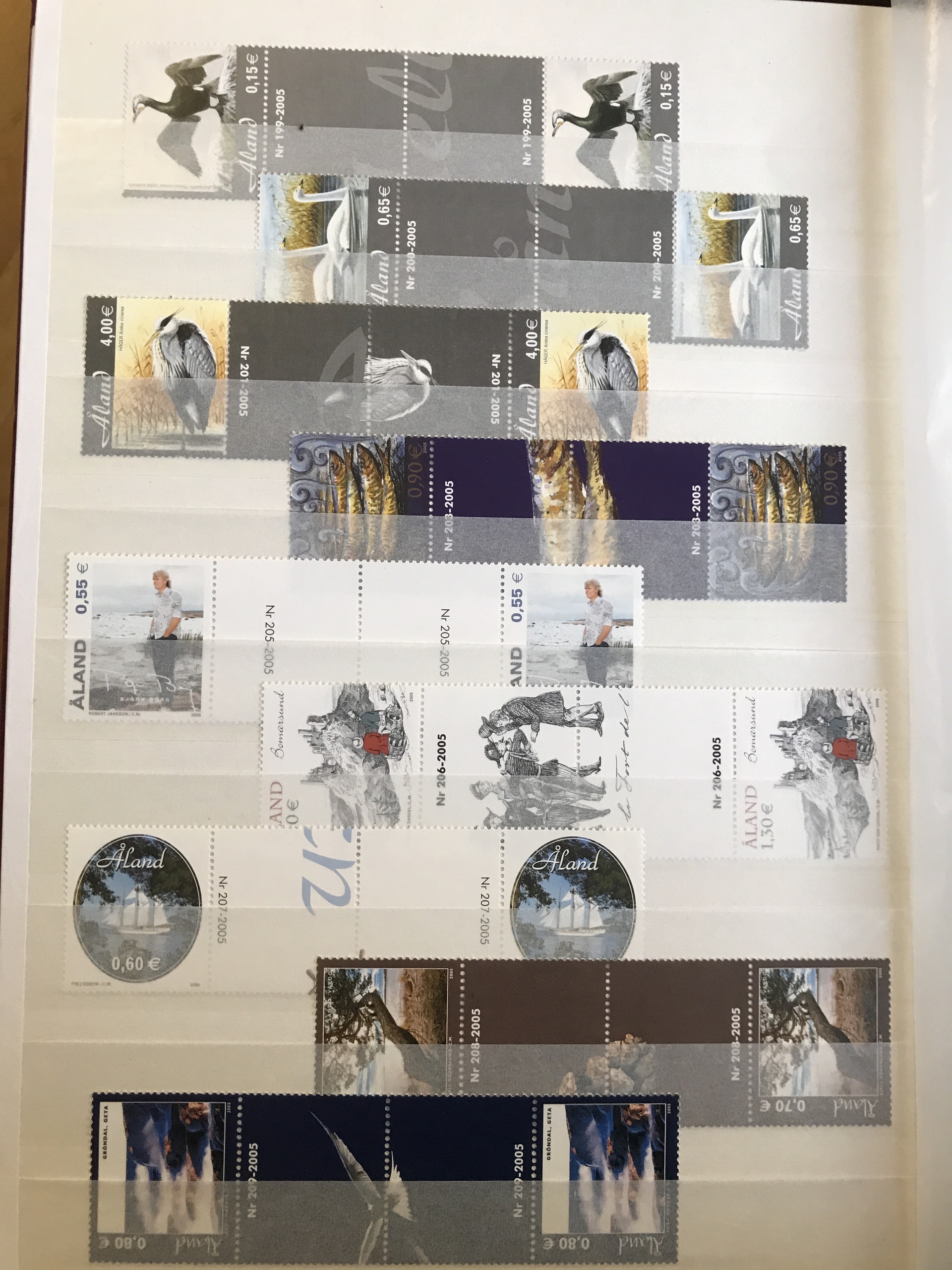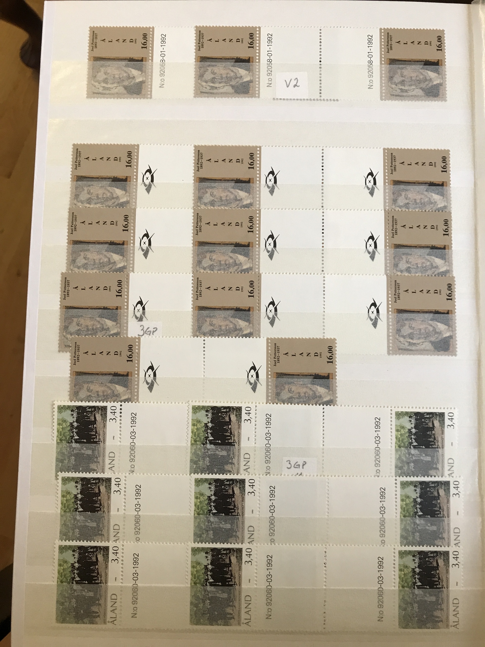 Åland. ★★. Two stockbooks with about 1330 Gutter pairs mostly 1984–1995 incl. units and some varieties, etc. The interesting variant manual 1993 is attached. Very high value and low starting price. Please see a selection of scans at www.philea.se. Fine quality.