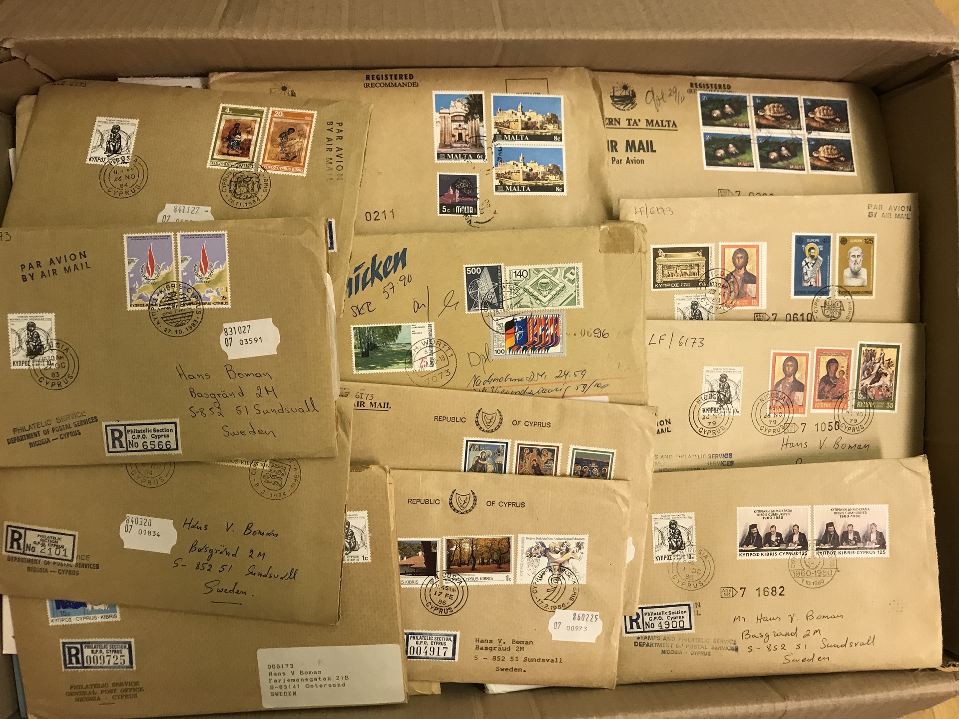 EUROPE. Miscellaneous. Removal box with mostly subscriptions 1970s–80s FDCs and stamps in envelopes. Many of the envelopes are not even opened. Approx. 25 kg.