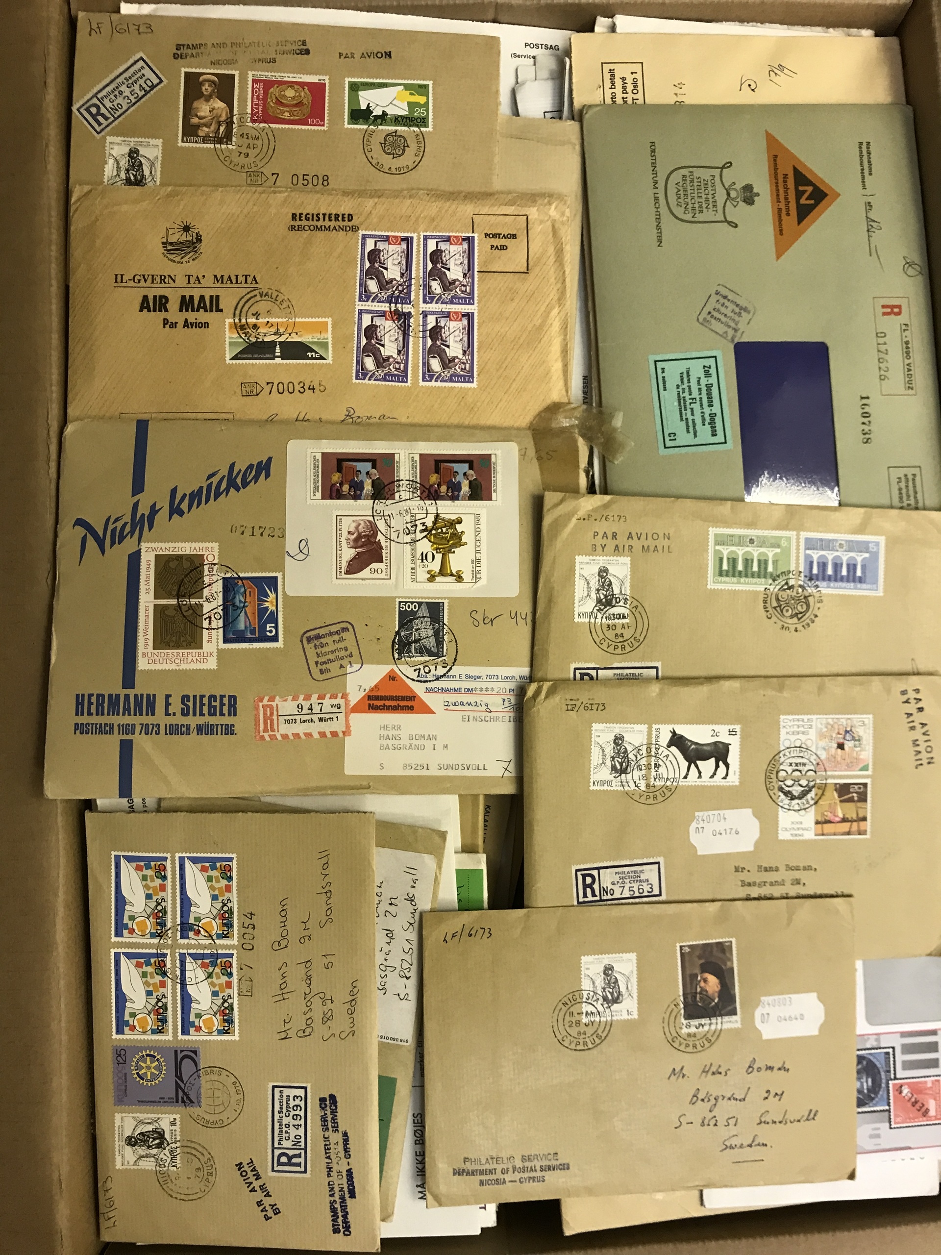 EUROPE. Miscellaneous. Removal box e.g. much FDCs and ** stamps in envelopes (subscriptions) mostly 1970s–80s, Temporary Post Offices cancellations Sweden, FDCs Finland, etc. Approx. 28 kg.