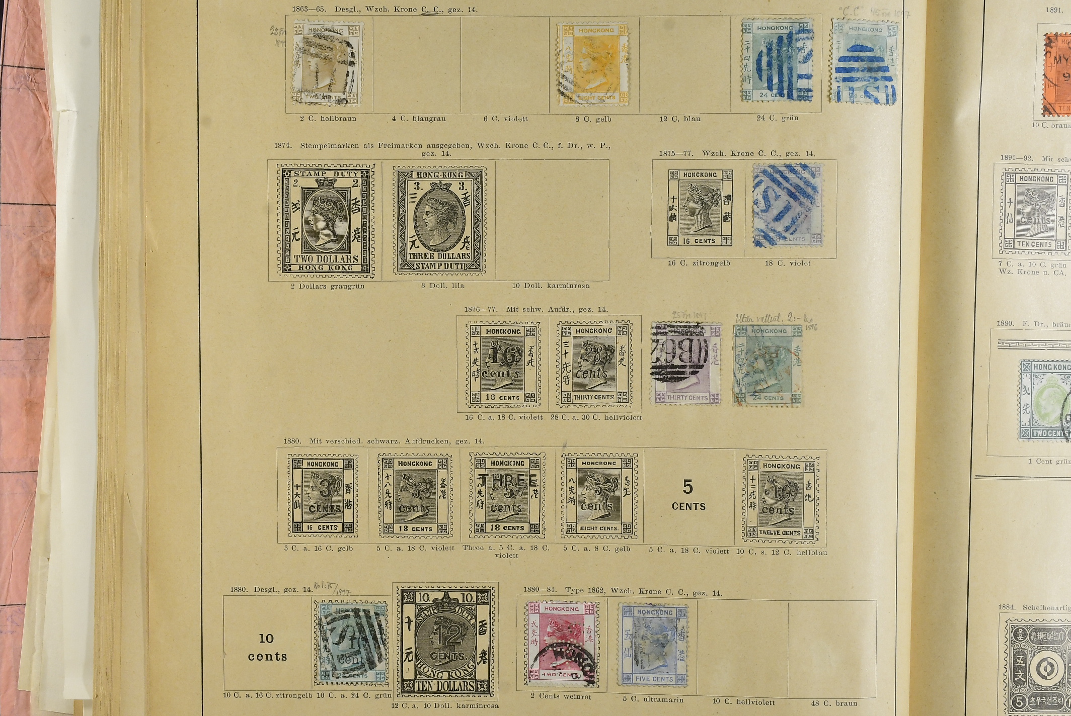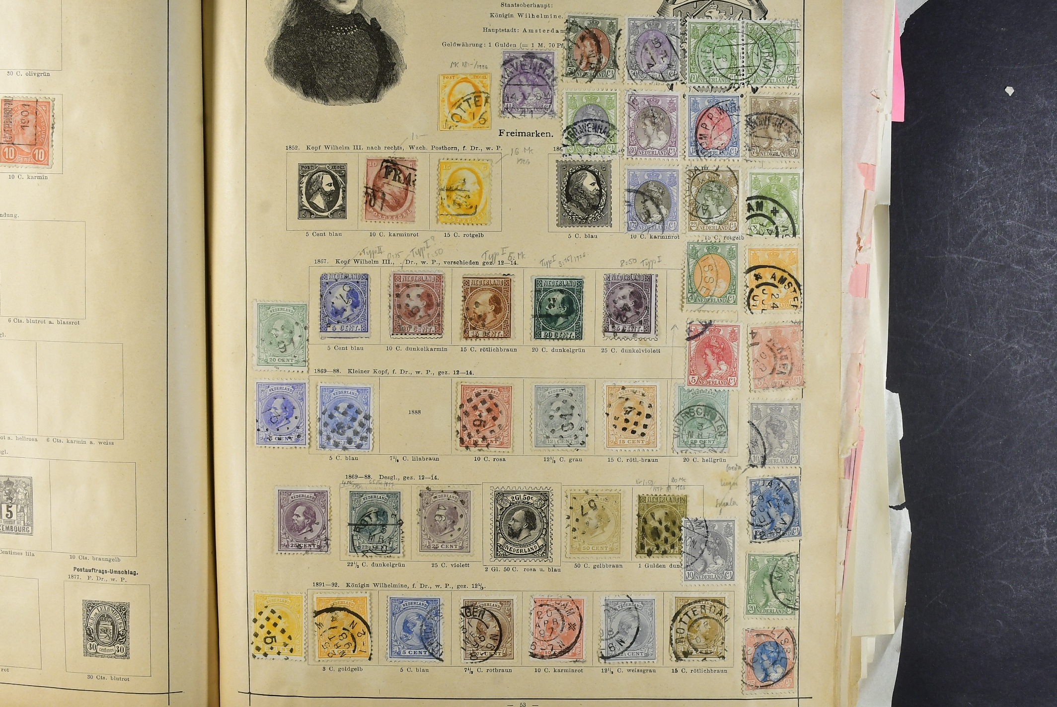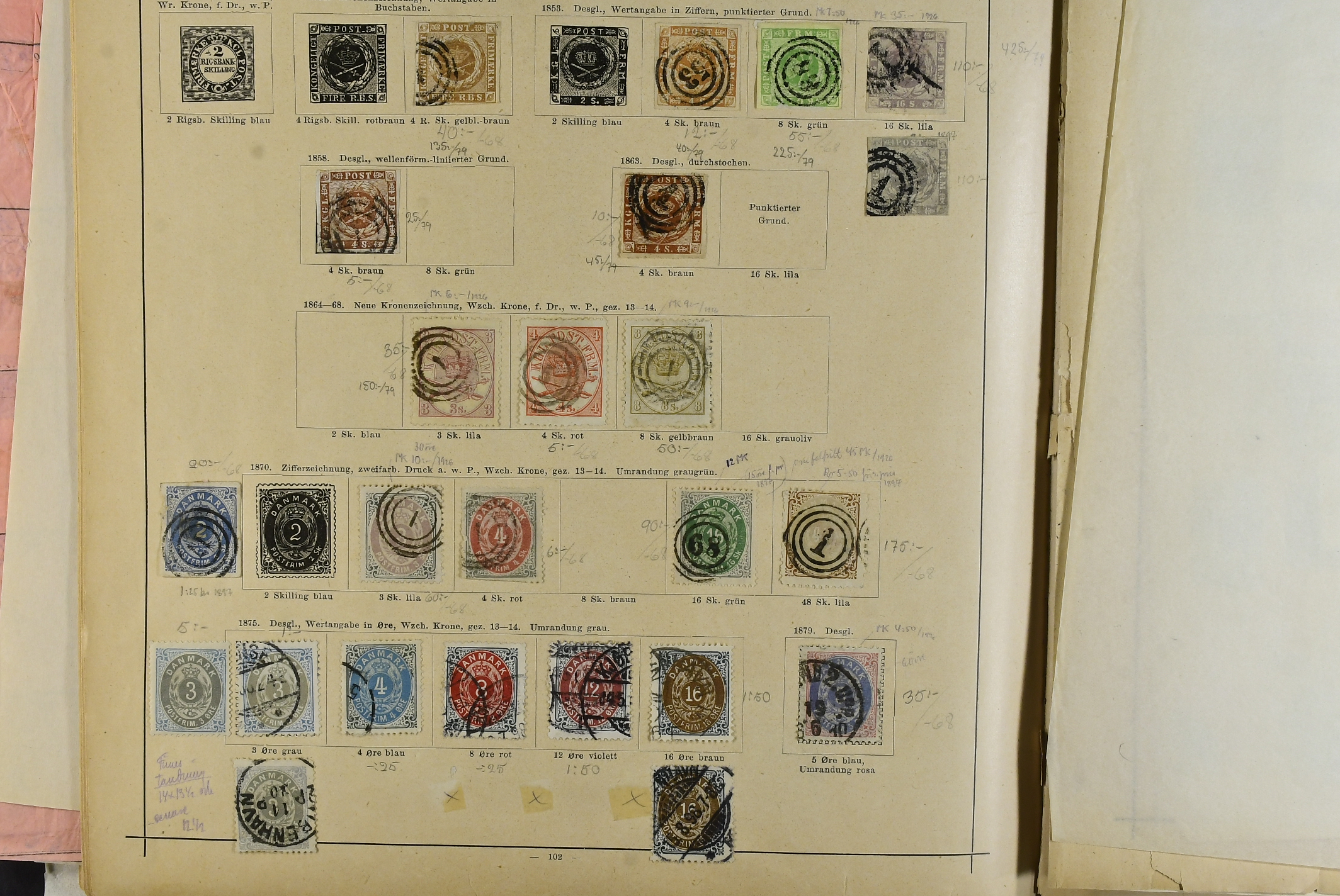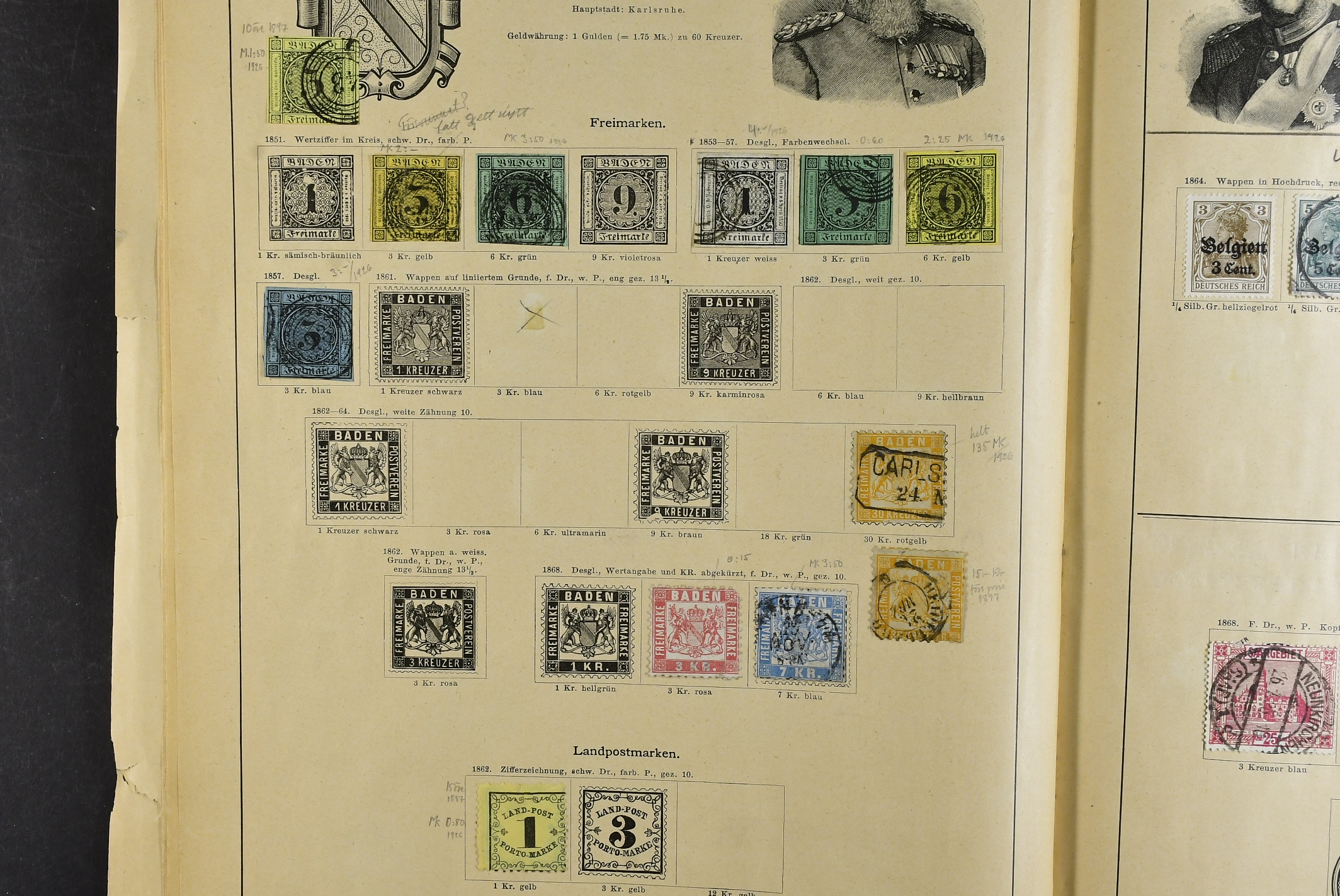 ALL WORLD. Collection ★/⊙ 1840–1930 in old album. An old Baumbach album with stamps from all over the world. Of European contries Austria, BeNeLux, France, Germany (states and Reich), the Scandinavian countries, Switzerland and the UK could be mentioned specifically. Additionally Hongkong, Japan and the US should be mentioned. When exploring the album, be careful as there are a lot ot loose album leaaves included and the album is very fragile. A lot to explore. Please see a selection of scans at www.philea.se. Mixed quality. (>1000)