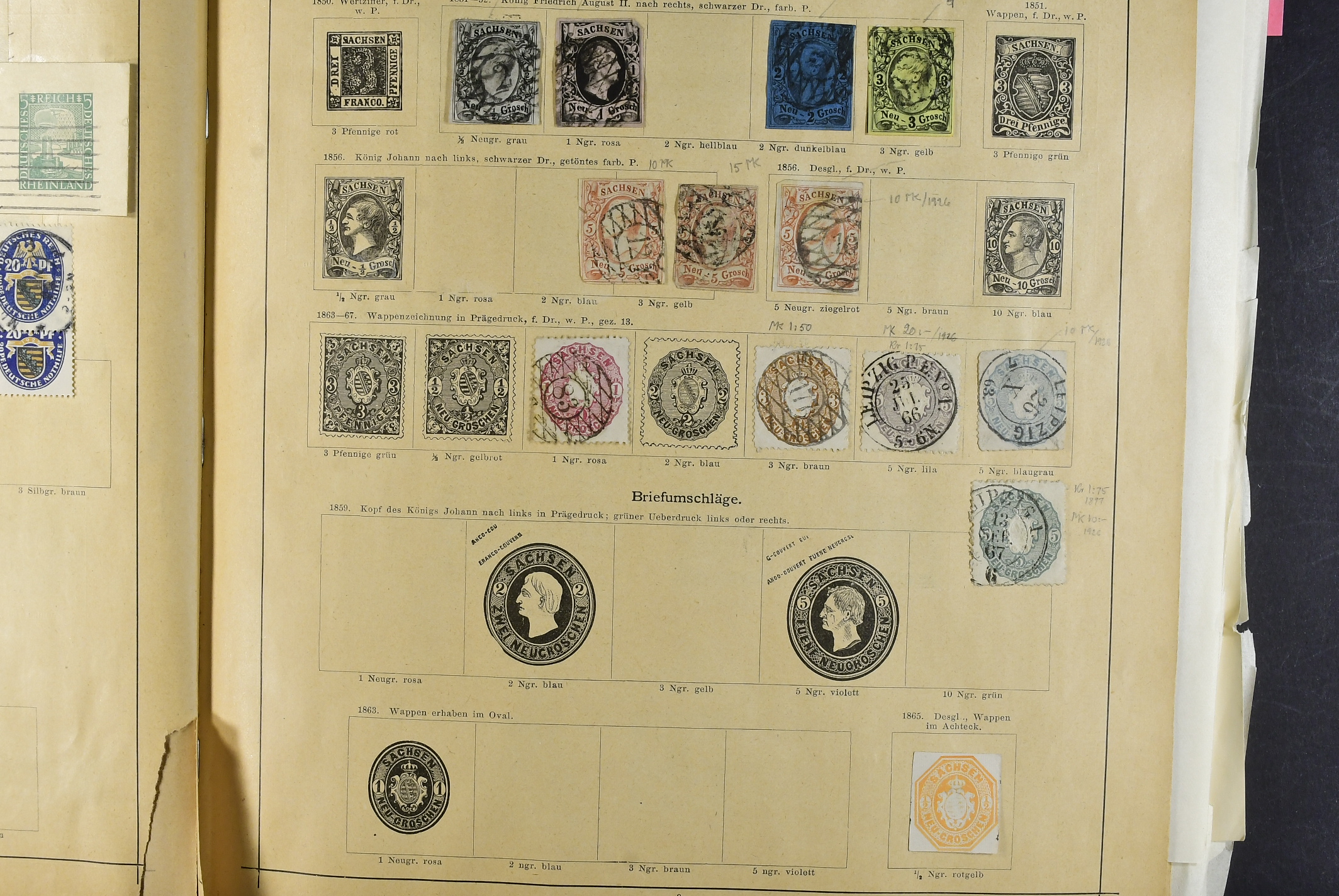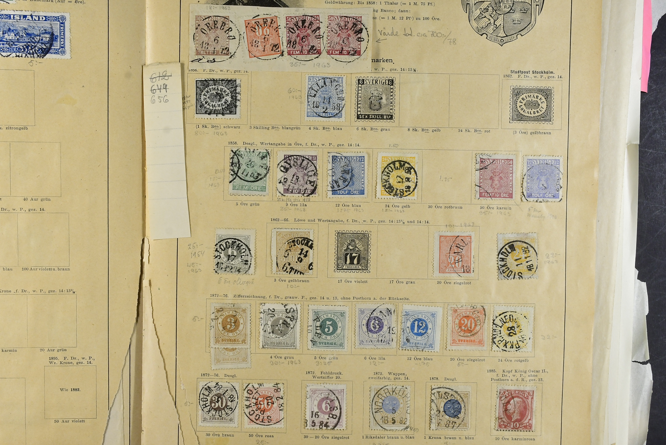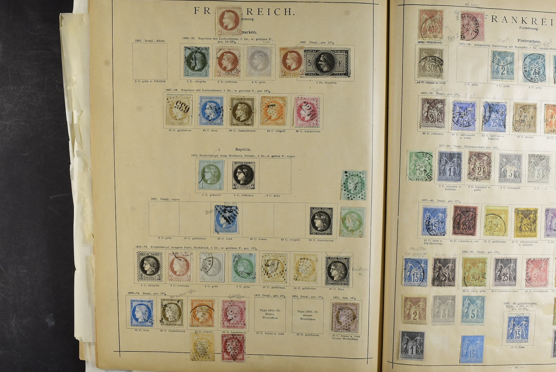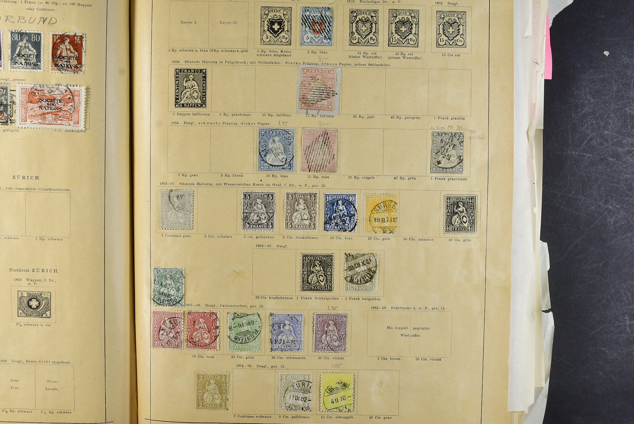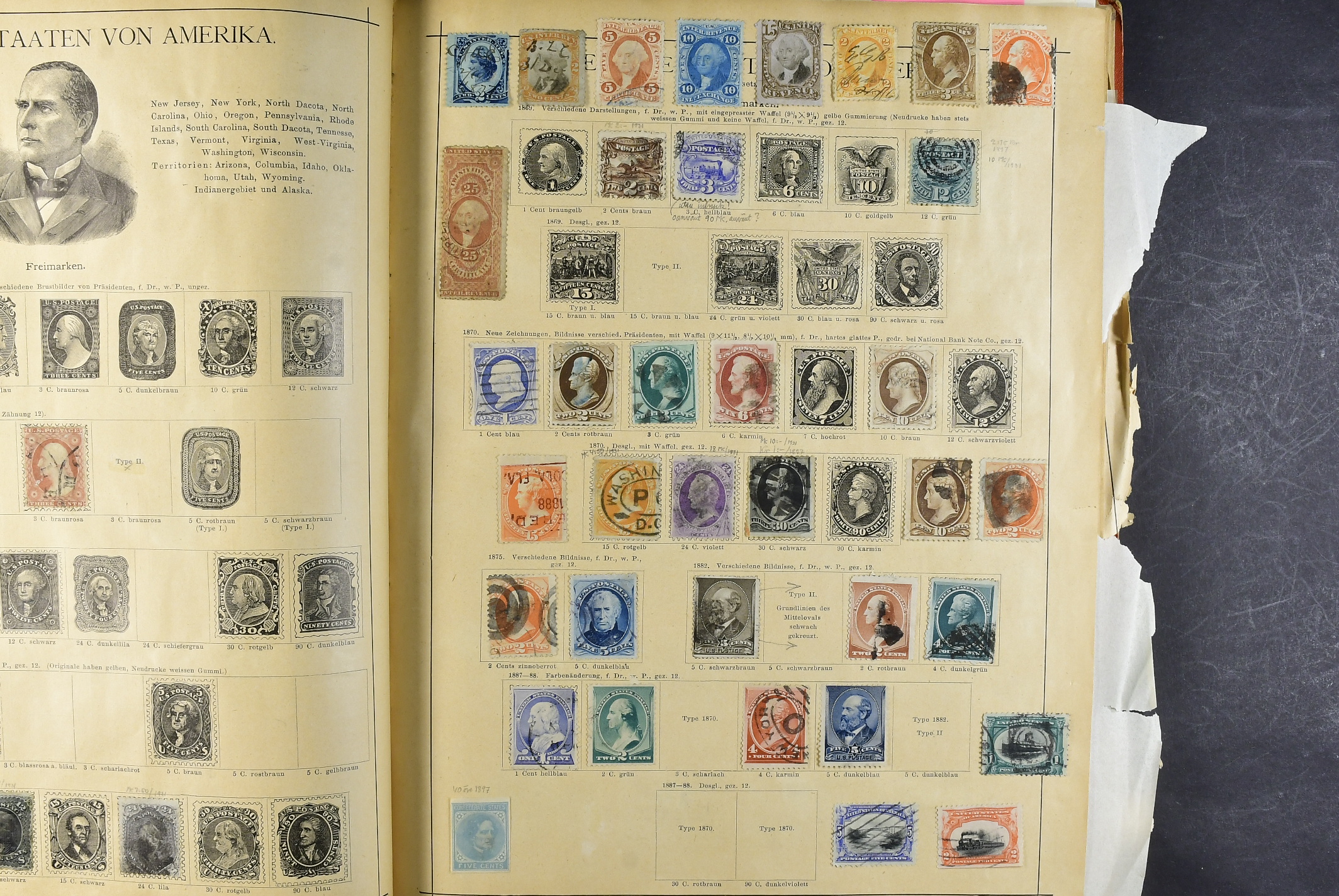 ALL WORLD. Collection ★/⊙ 1840–1930 in old album. An old Baumbach album with stamps from all over the world. Of European contries Austria, BeNeLux, France, Germany (states and Reich), the Scandinavian countries, Switzerland and the UK could be mentioned specifically. Additionally Hongkong, Japan and the US should be mentioned. When exploring the album, be careful as there are a lot ot loose album leaaves included and the album is very fragile. A lot to explore. Please see a selection of scans at www.philea.se. Mixed quality. (>1000)