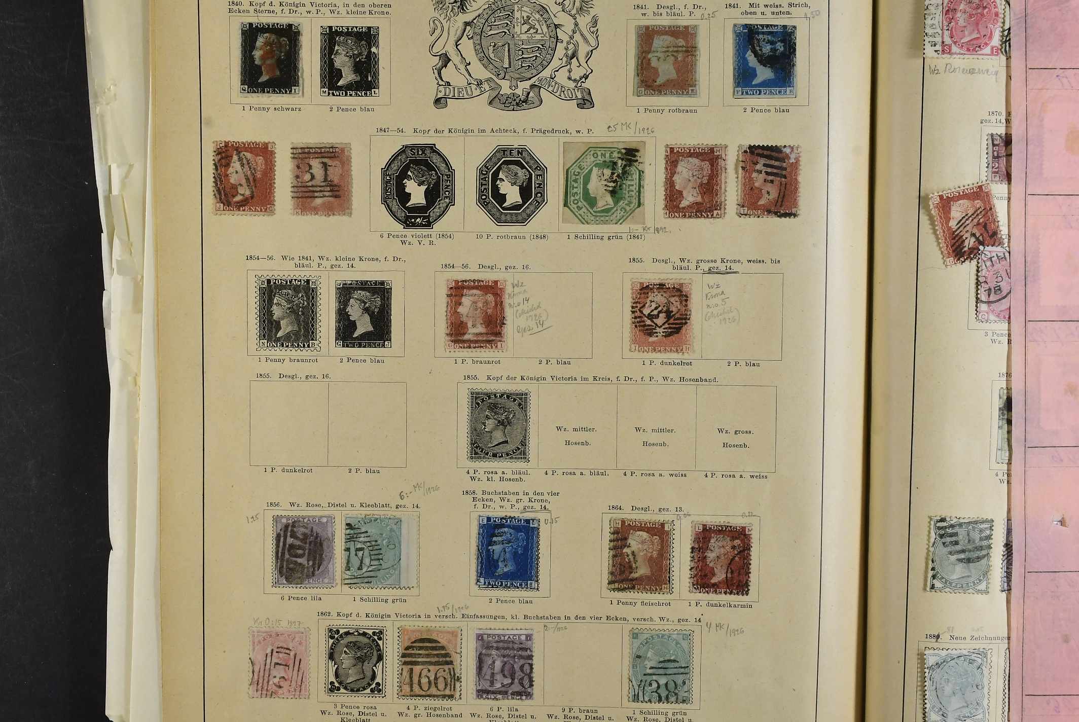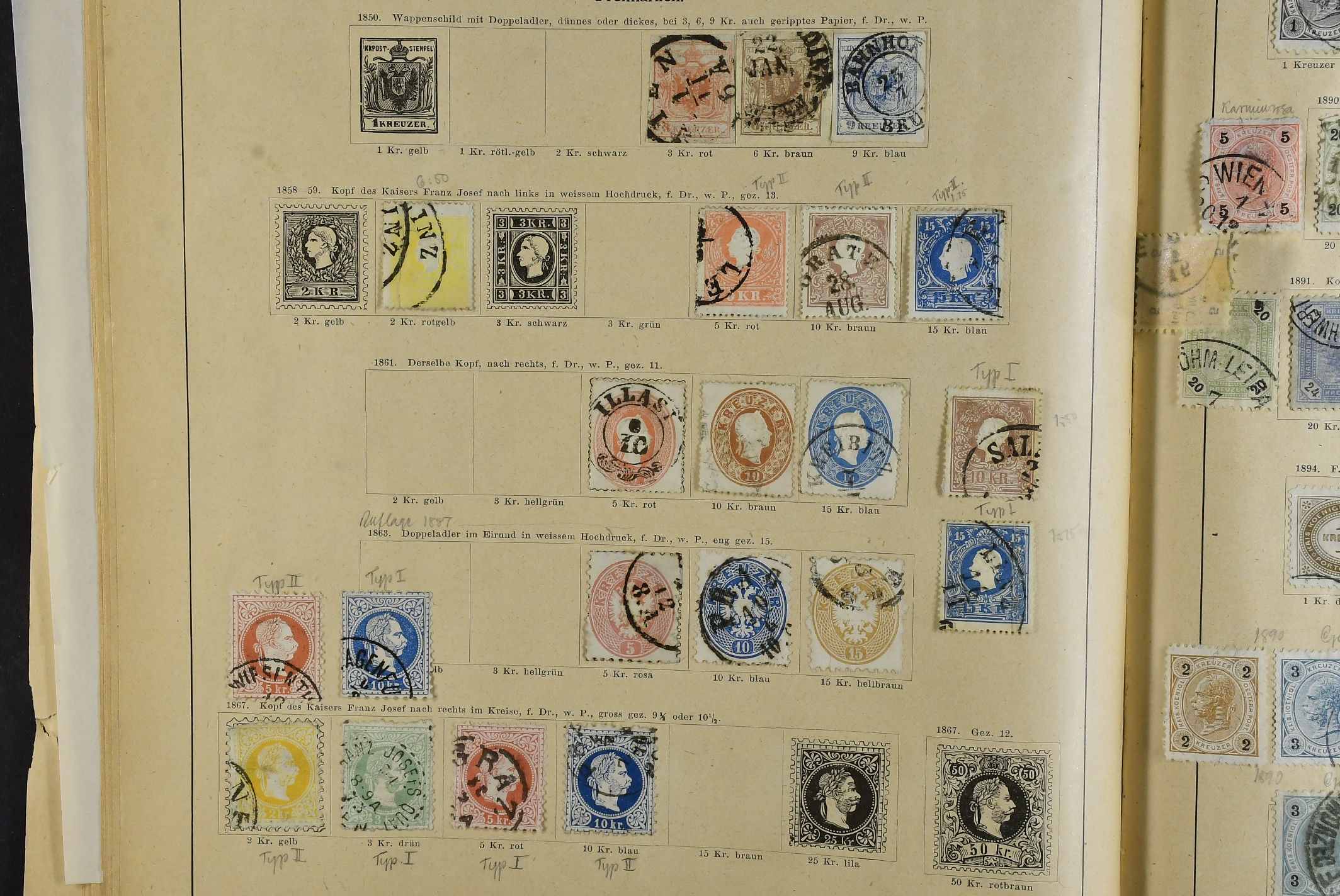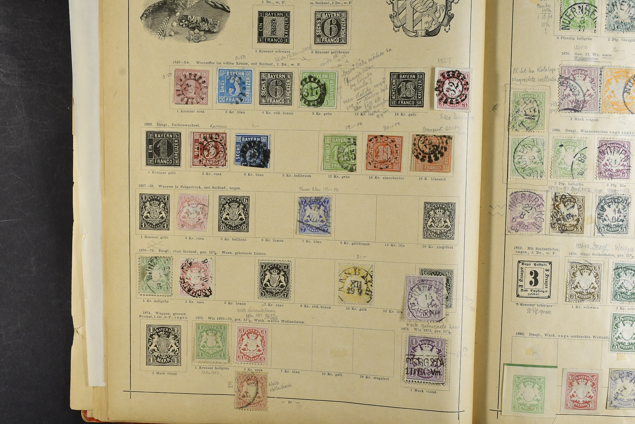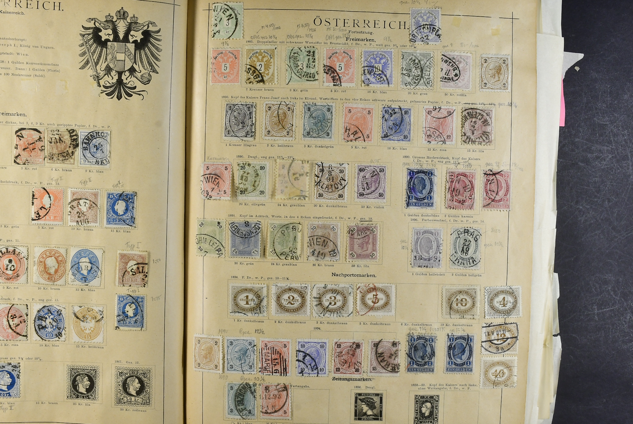 ALL WORLD. Collection ★/⊙ 1840–1930 in old album. An old Baumbach album with stamps from all over the world. Of European contries Austria, BeNeLux, France, Germany (states and Reich), the Scandinavian countries, Switzerland and the UK could be mentioned specifically. Additionally Hongkong, Japan and the US should be mentioned. When exploring the album, be careful as there are a lot ot loose album leaaves included and the album is very fragile. A lot to explore. Please see a selection of scans at www.philea.se. Mixed quality. (>1000)