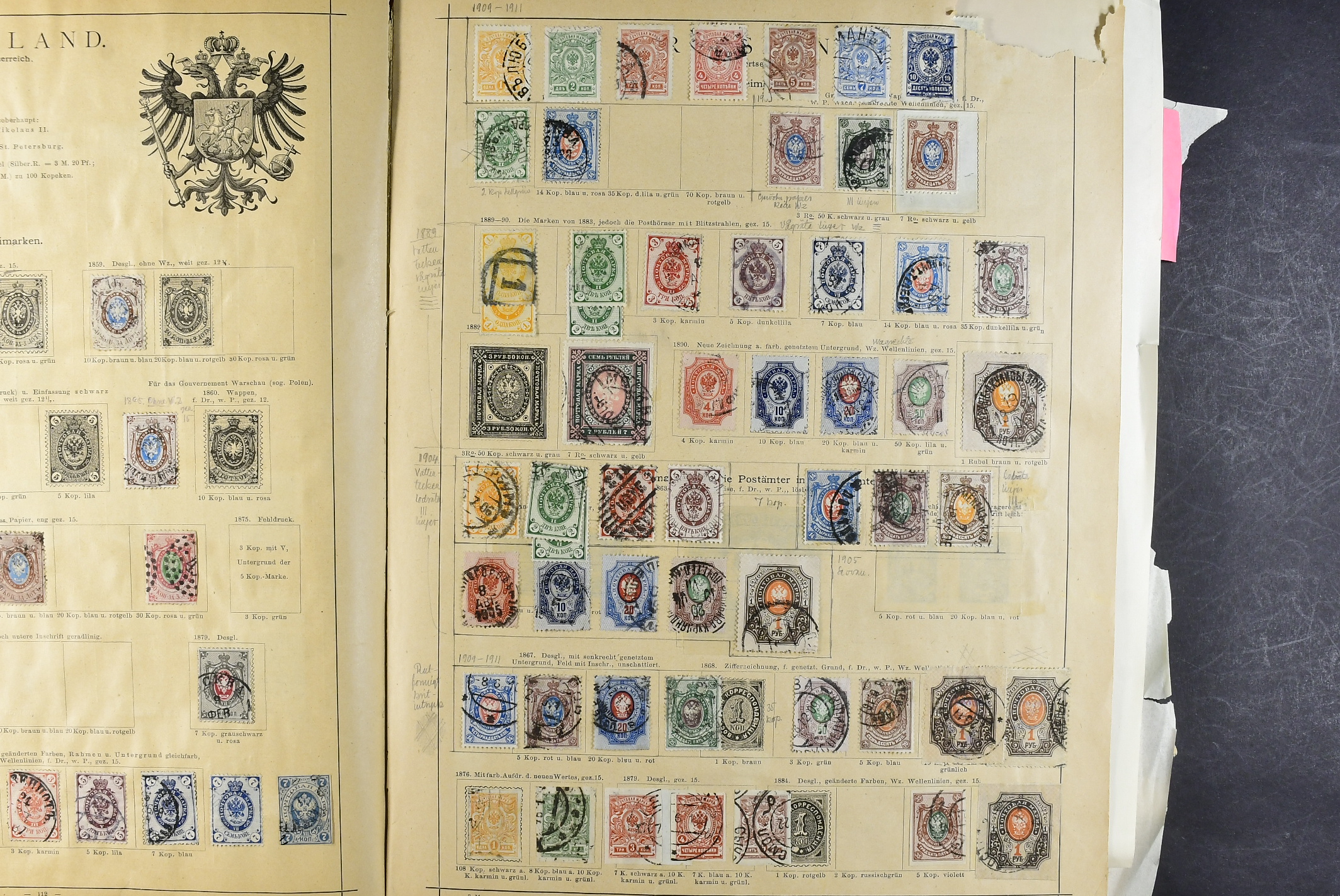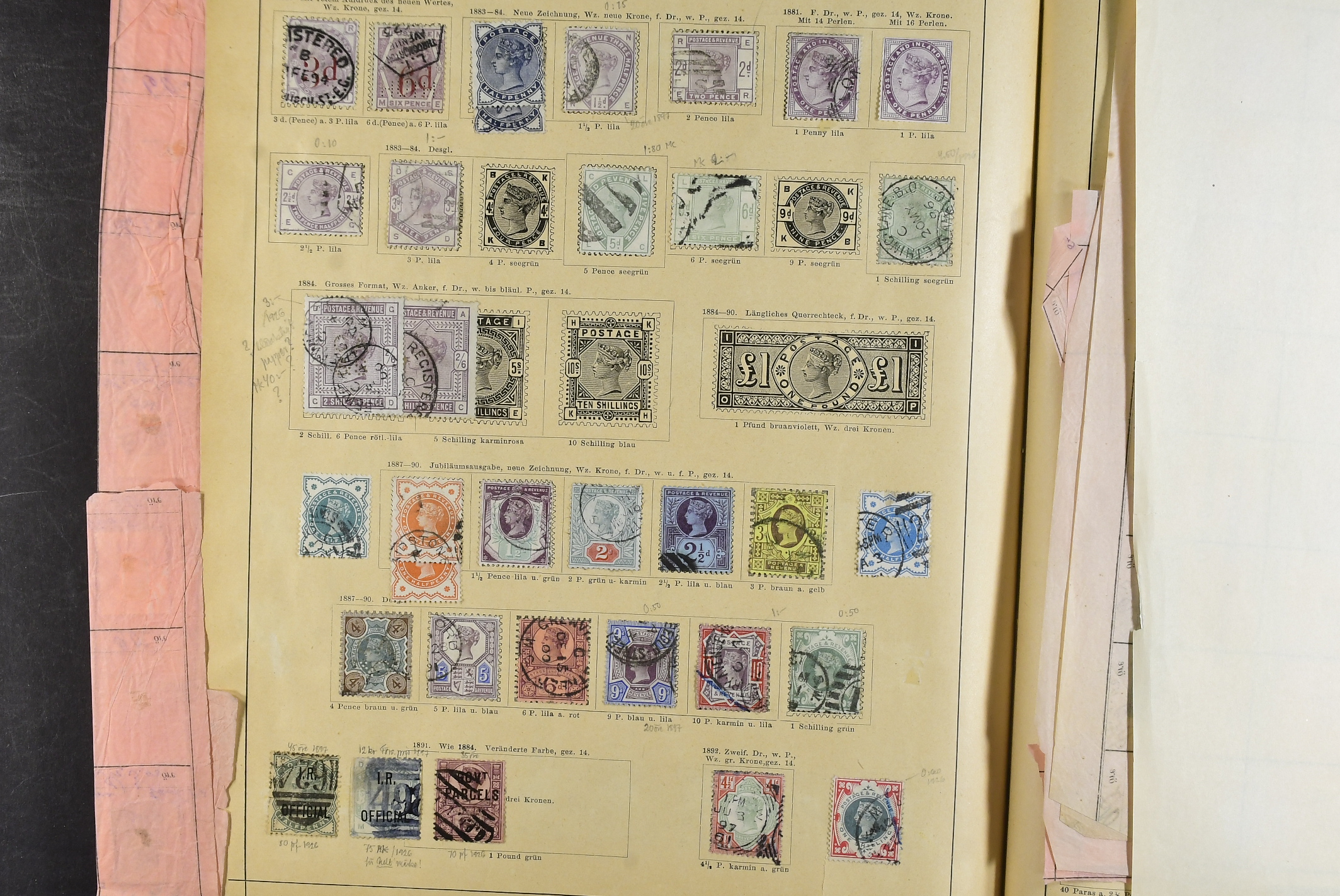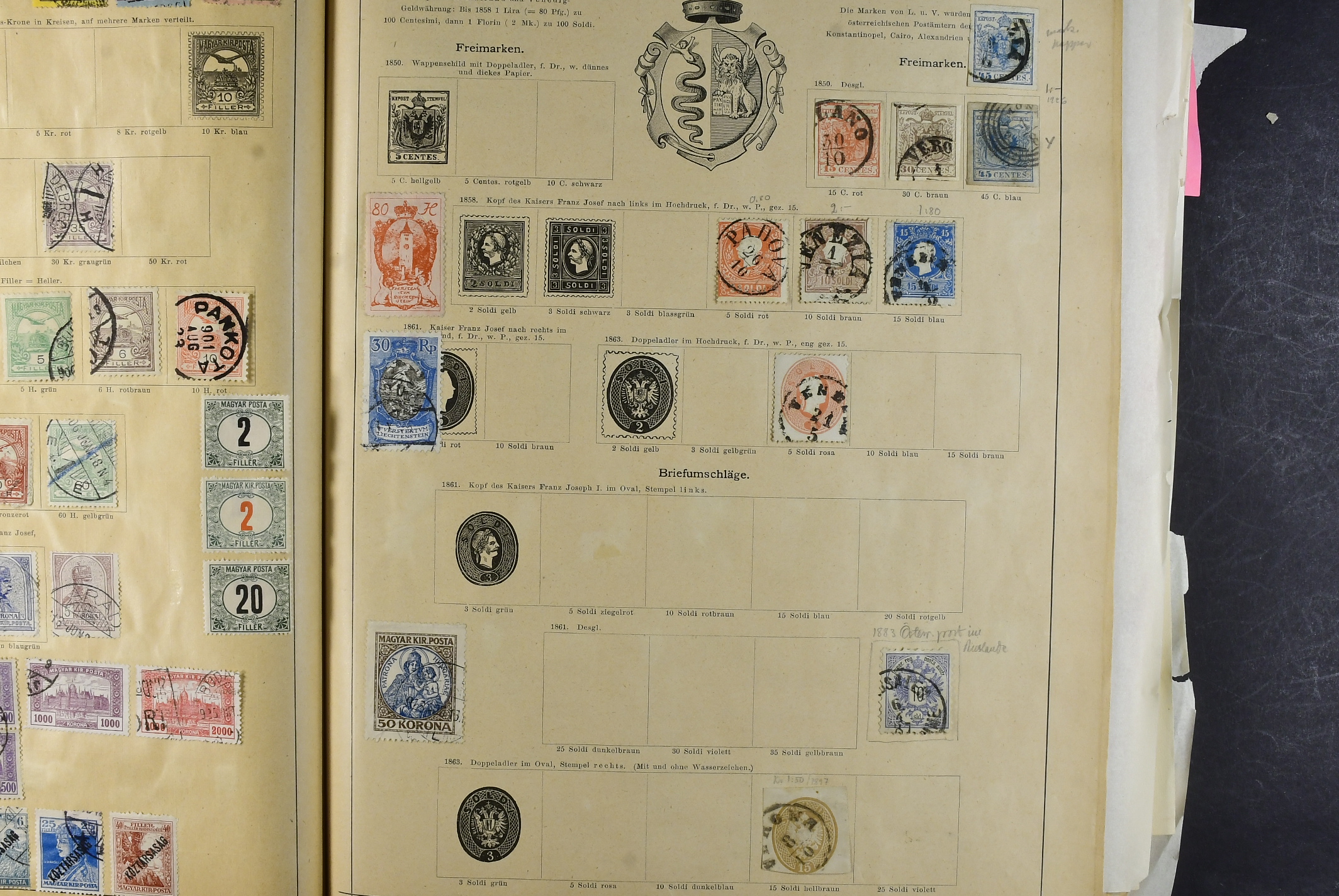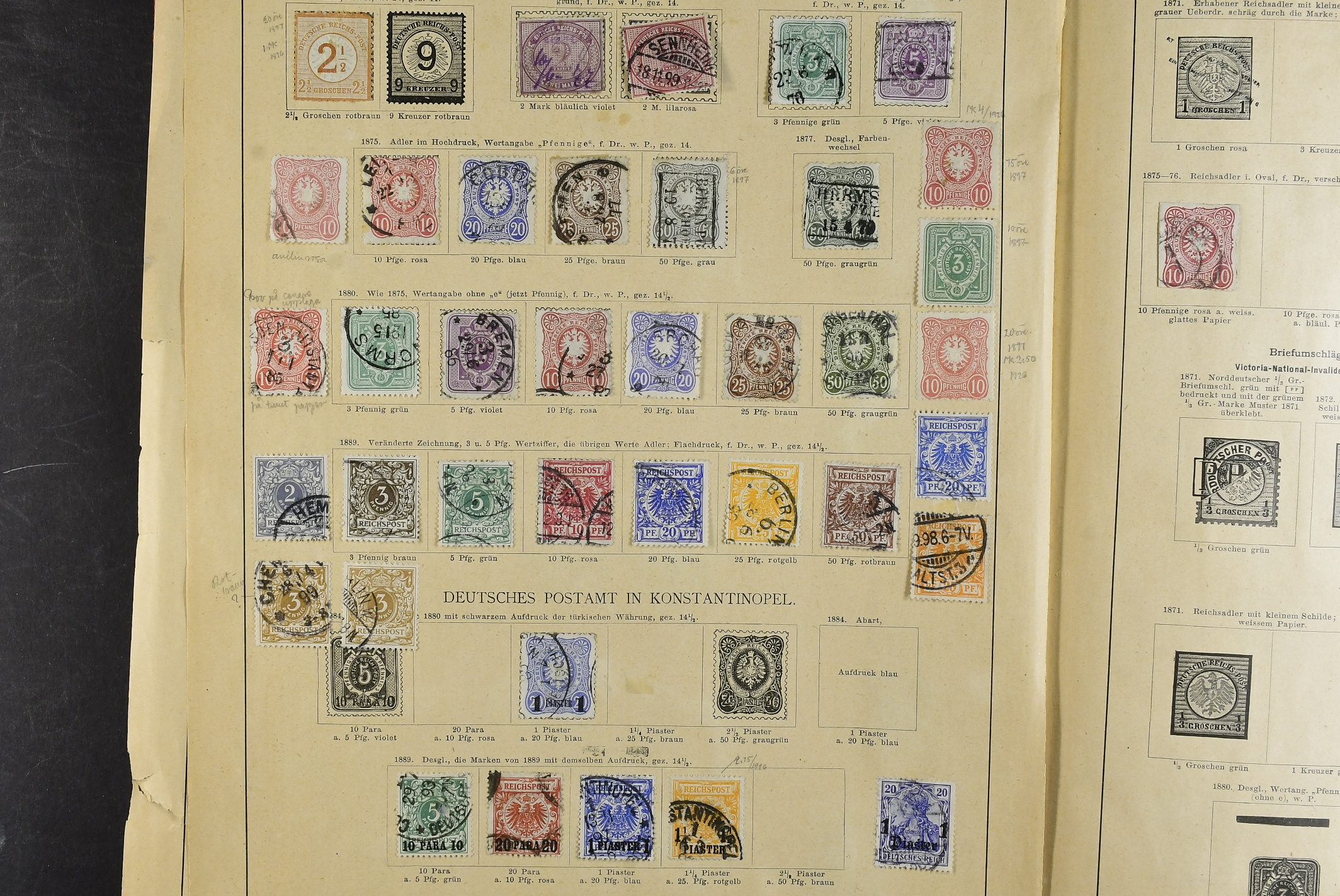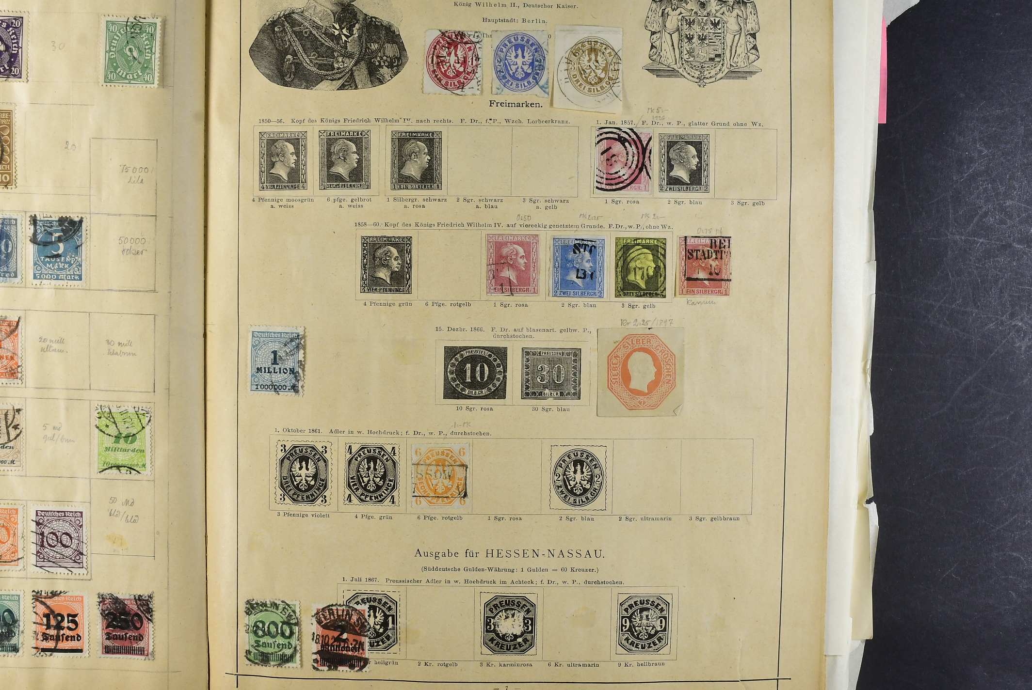 ALL WORLD. Collection ★/⊙ 1840–1930 in old album. An old Baumbach album with stamps from all over the world. Of European contries Austria, BeNeLux, France, Germany (states and Reich), the Scandinavian countries, Switzerland and the UK could be mentioned specifically. Additionally Hongkong, Japan and the US should be mentioned. When exploring the album, be careful as there are a lot ot loose album leaaves included and the album is very fragile. A lot to explore. Please see a selection of scans at www.philea.se. Mixed quality. (>1000)