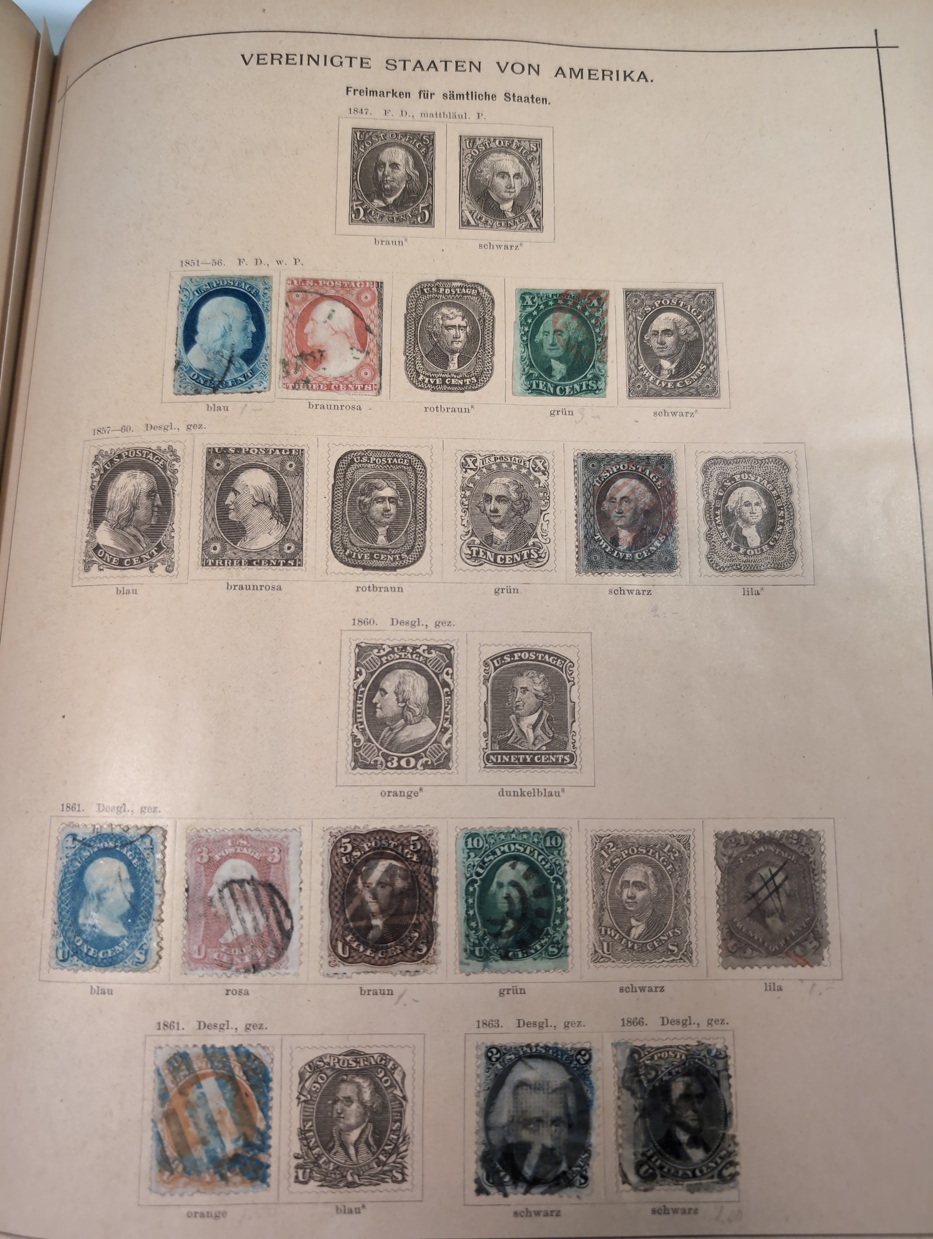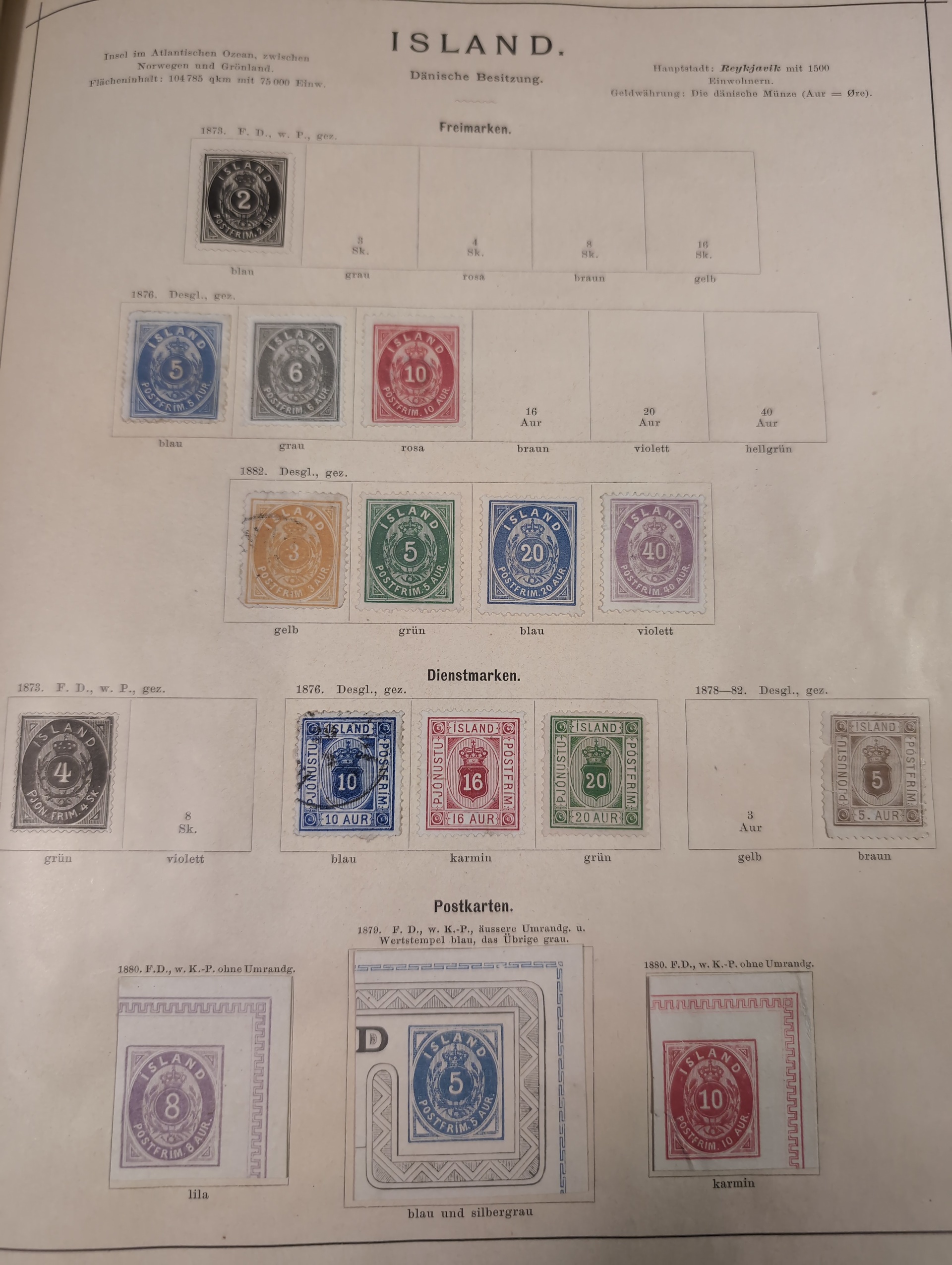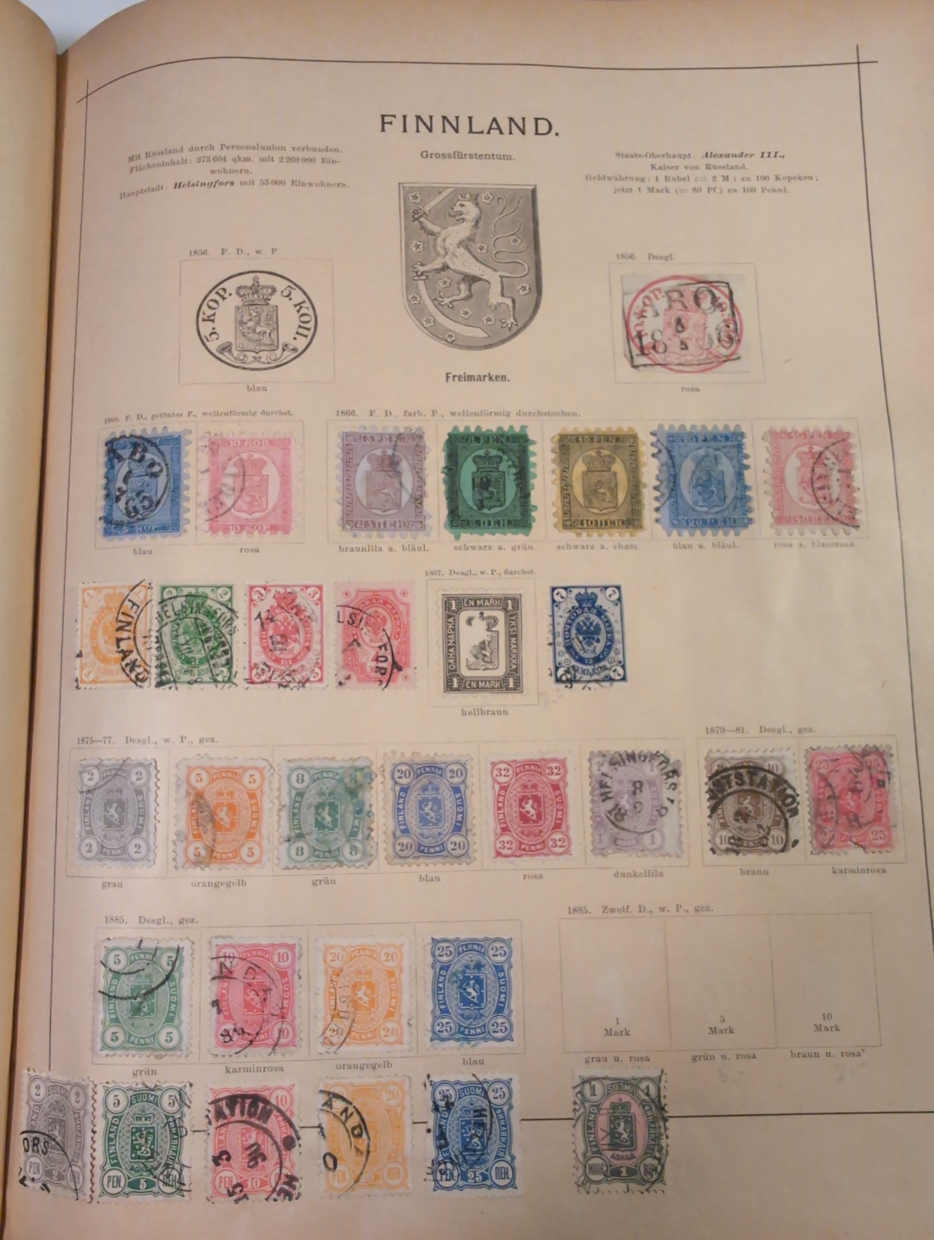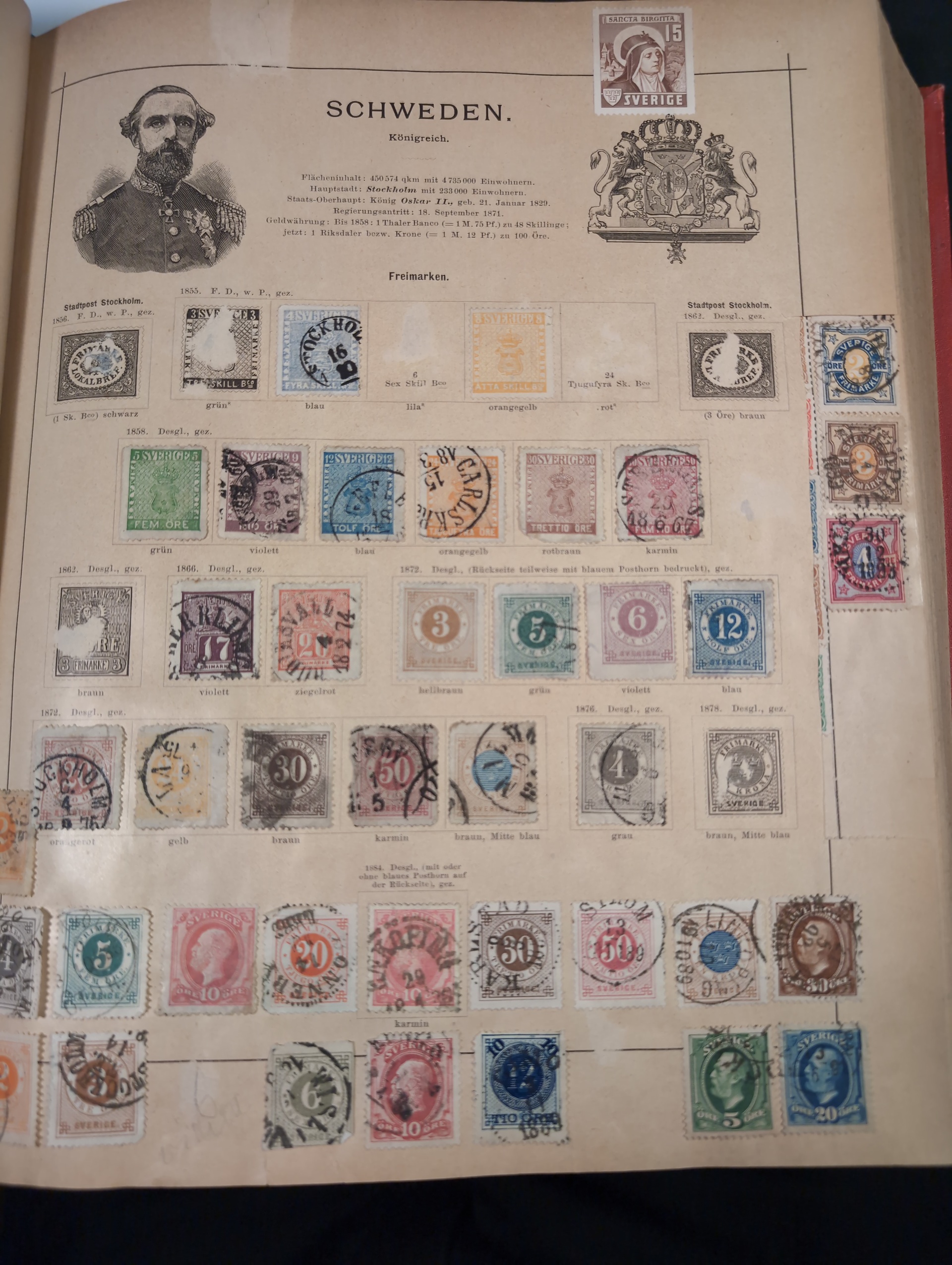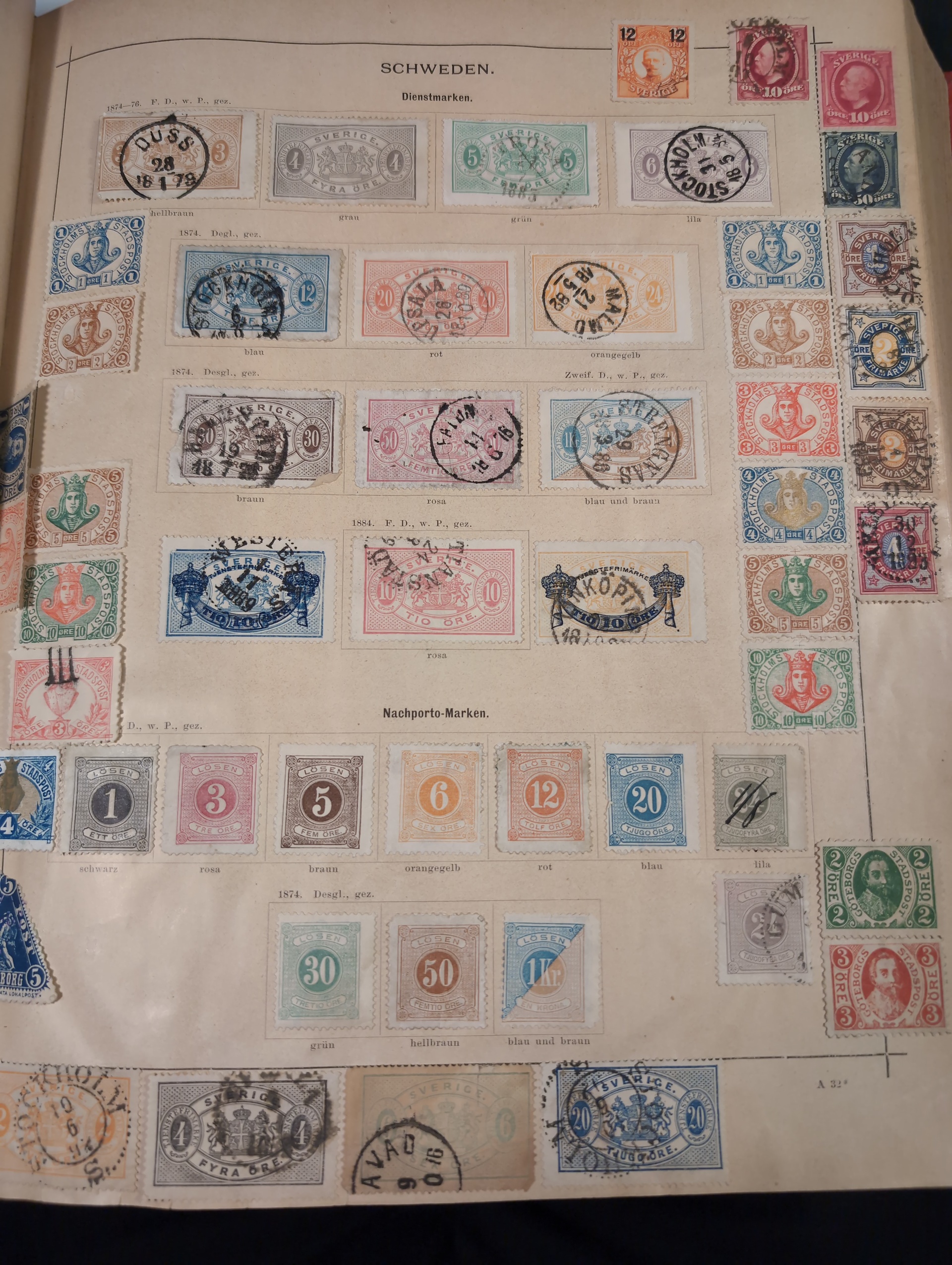 ALL WORLD. Collection ★/⊙ 1840–ca. 1890 in album. Old Schaubek album from 1883. Broken spine otherwise in nice condition. Good sections of Nordic countries and Europe with many a bit better stamps. Stamps are in inferior to very fine condition and all seems to be glued into the album, a test showed that they are possible to salvage. Carefull viewing is recommended. Please see a selection of scans at www.philea.se. Very mixed quality. (ca. 2500)