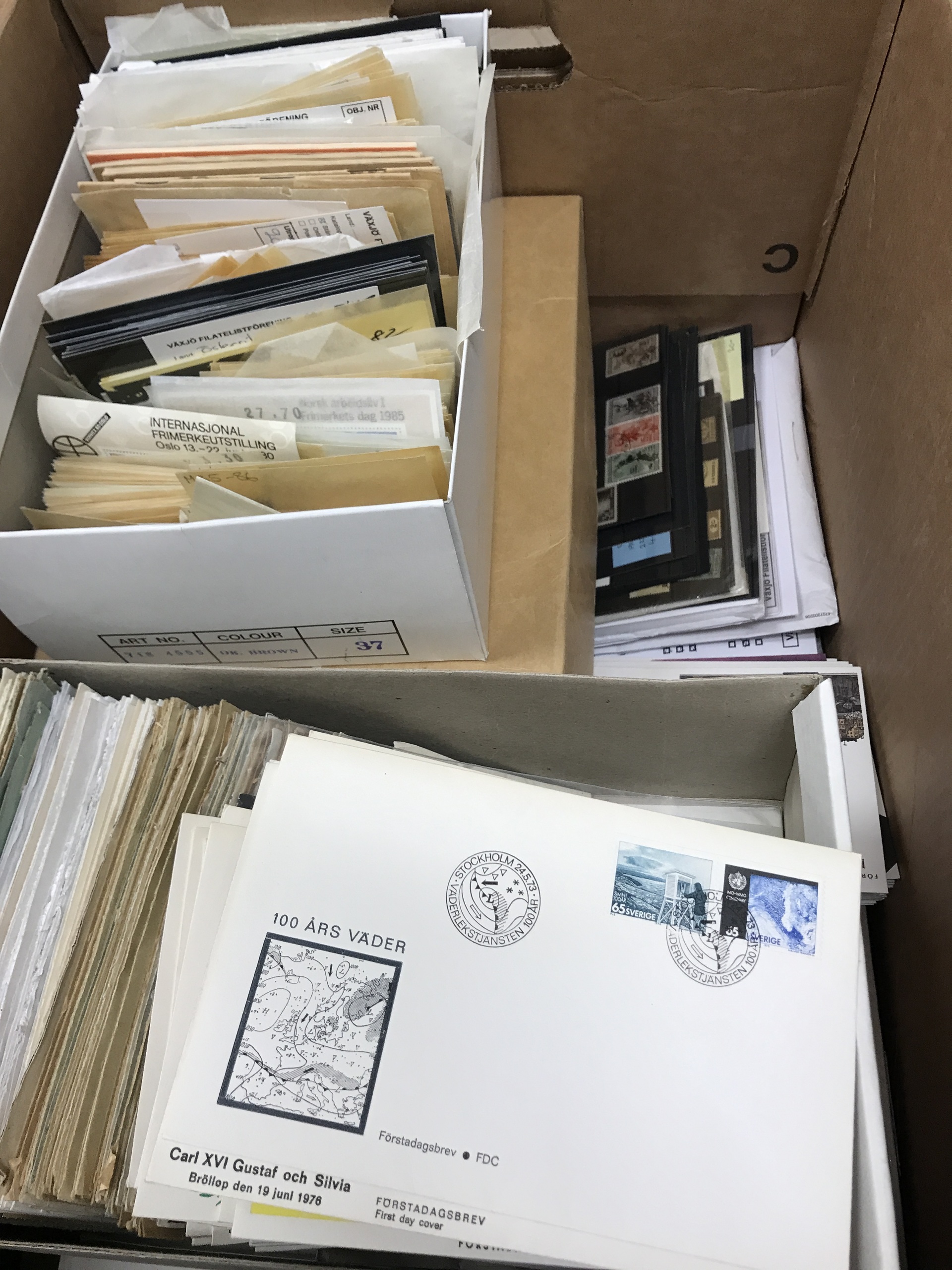 ALL WORLD. Accumulation ★★/★/⊙. Lot of different countries in removal box, for instance Soviet Union/Russia, Hungary, Belgium, Austria. Interesting letter sent by British Tin-Can mail from Tonga to Tasmania 1936. Nordic countries with some facevalue 1970–80s, not counted. Letters, special cancelations, postcards and Swedish FDC with vignettes 1960–1970s and a bundle of modern ones 2000–10s. Approx. 14 kg.