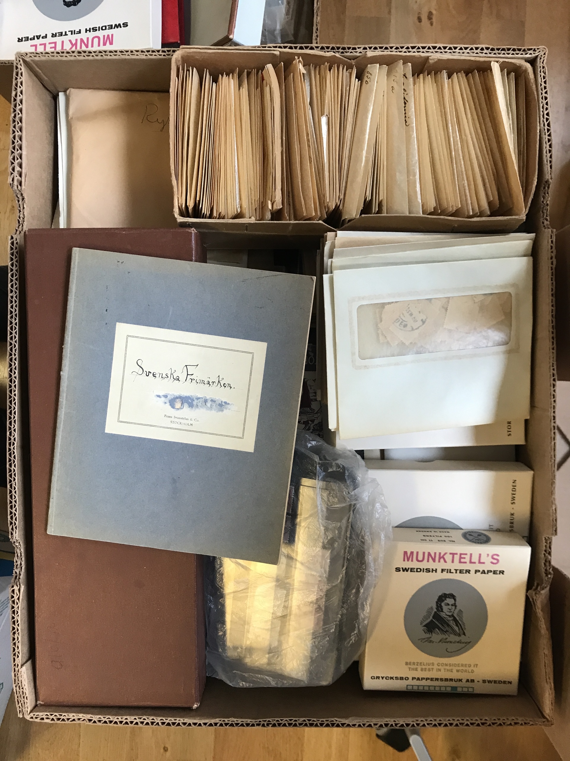 ALL WORLD. Mostly used. Interesting box with stamps in envelopes, leaves and circulation booklets, etc. Containing e.g. Baltic states, Germany and Persia, etc. Approx. 13 kg.
