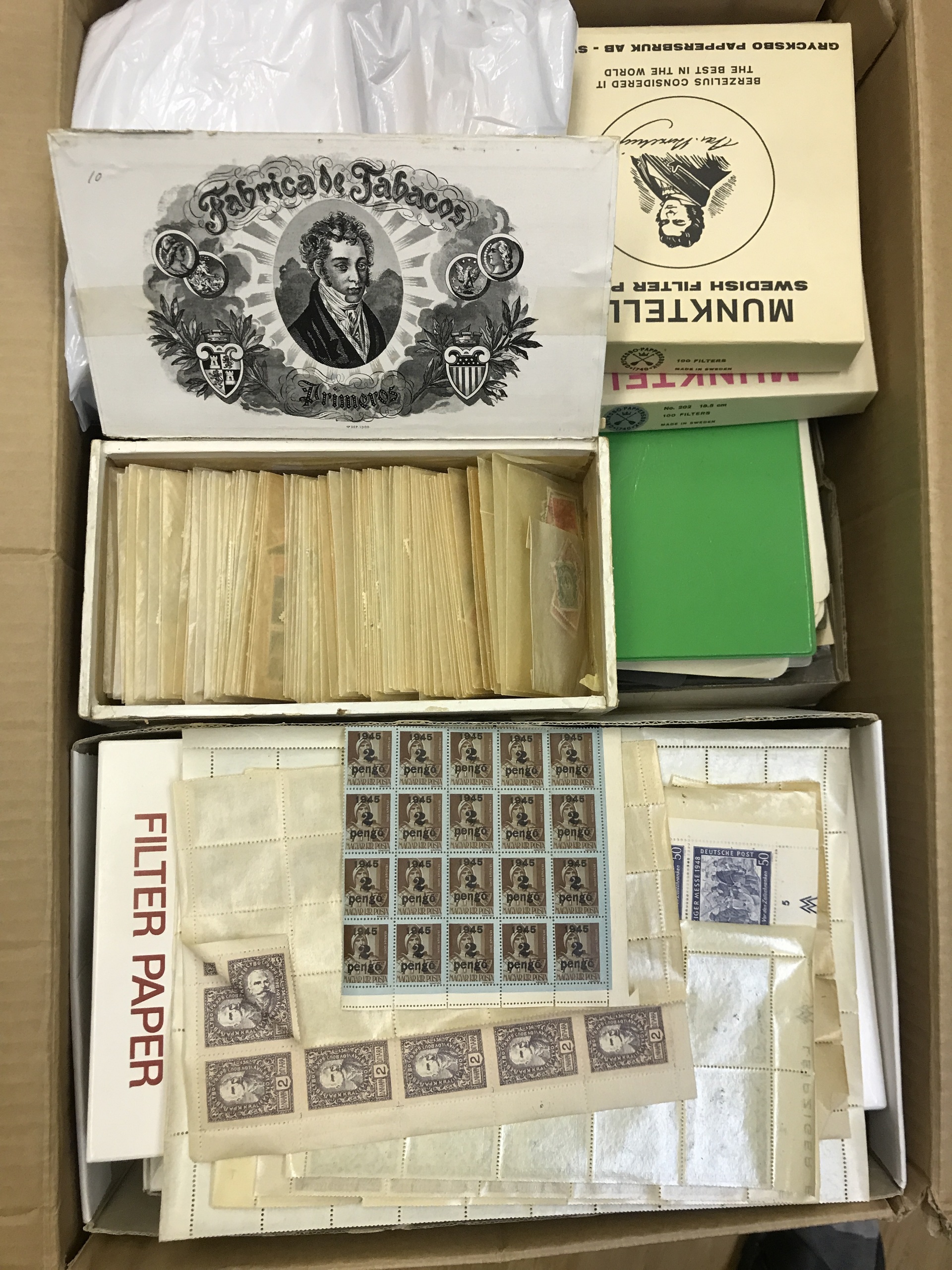 ALL WORLD. Mostly used. Removal box with 10000s of stamps old–modern from a large number of countries incl. also **/* here and there. Approx. 19 kg.