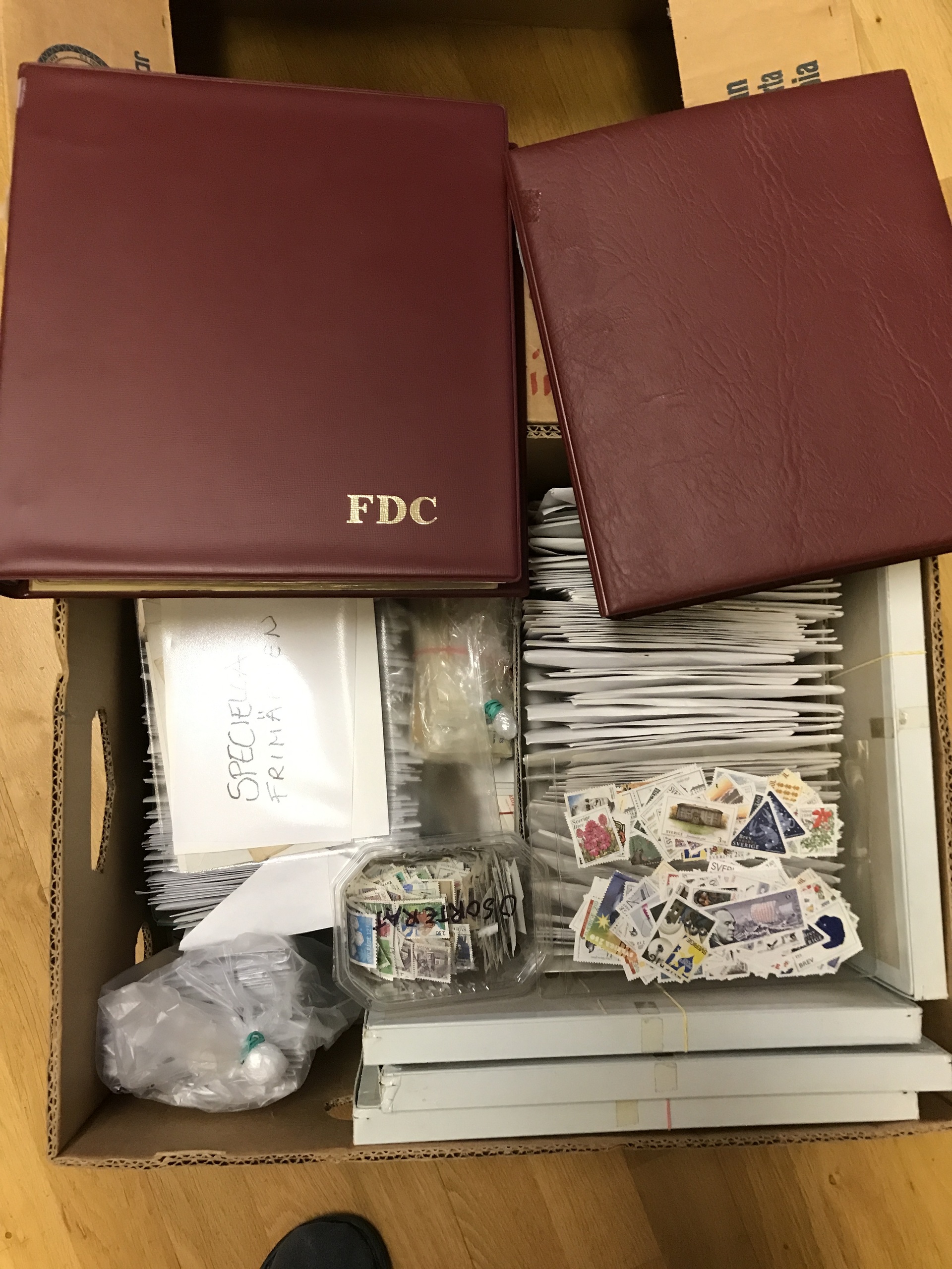 ALL WORLD. Mostly used. Banana box with 1000s of stamps old–modern in envelopes. E.g. much Sweden incl. also several modern unused without gum. Also two binders with FDCs Åland and Faroes. Approx. 11 kg.